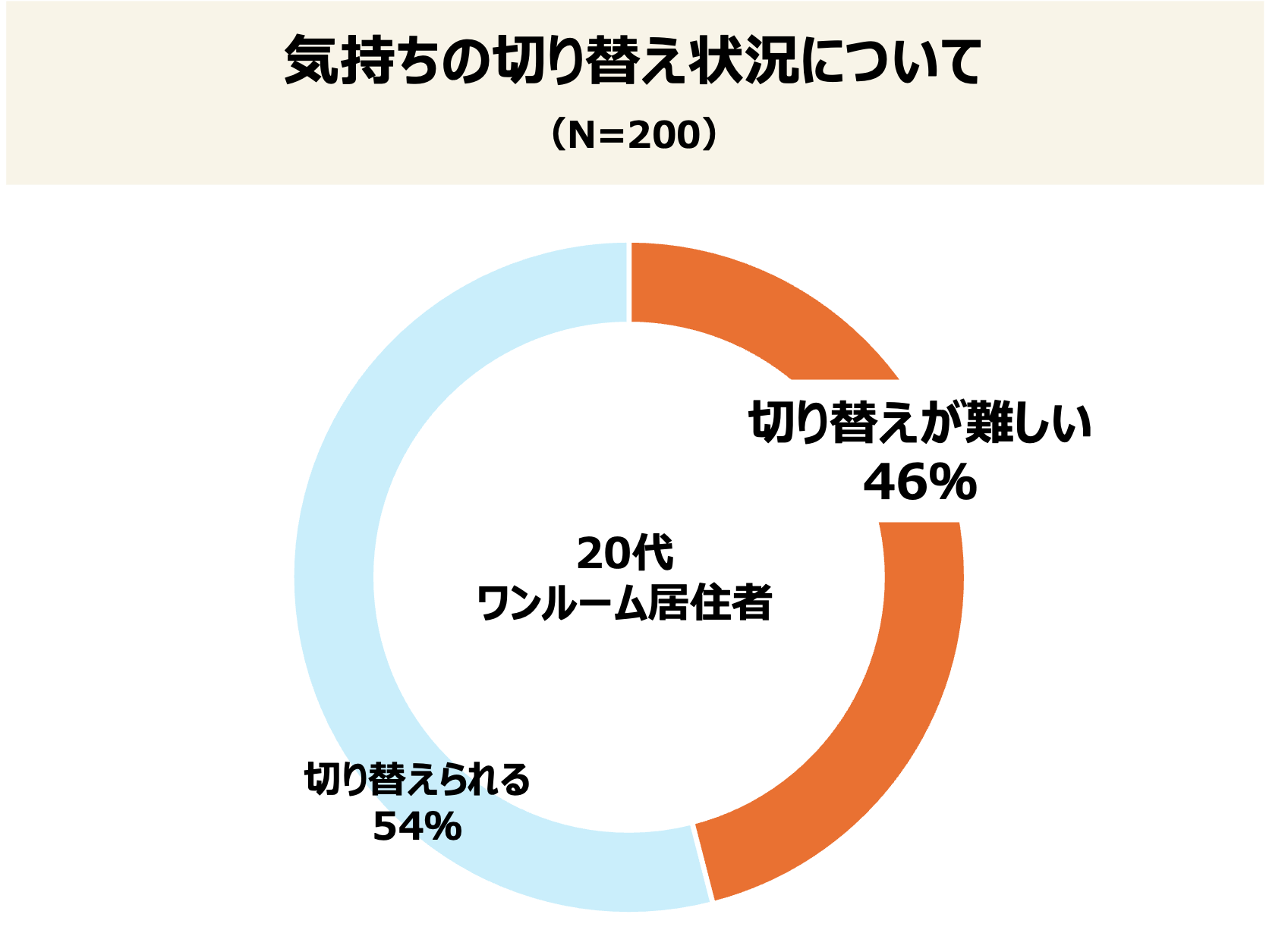 ・20代ワンルーム居住者の約半数(46%)が「同じ部屋での食事・作業・睡眠」に気持ちの切り替えが難しい