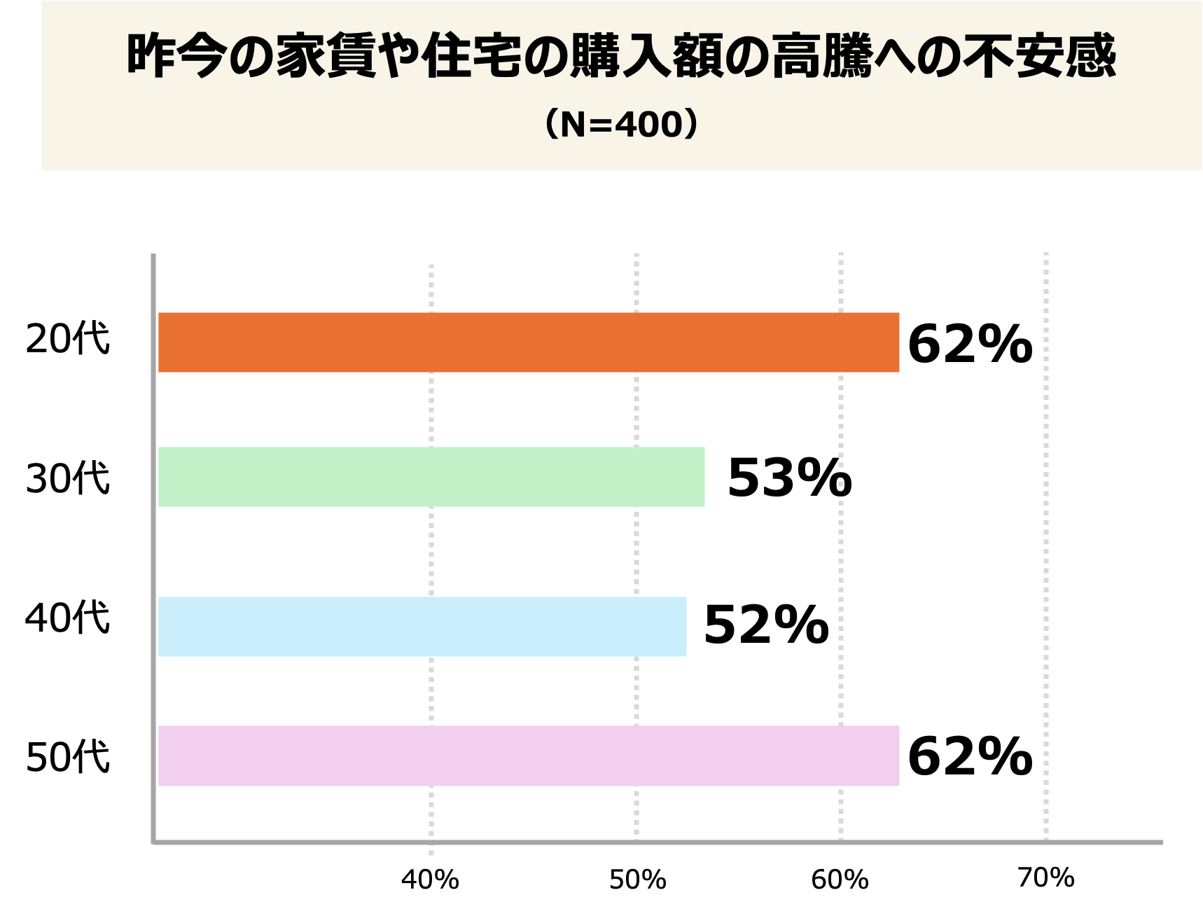 現在の住居に関して、「空間・スペース的なストレスの有無」を聞いたところ、ワンルーム居住者の40%がストレスを感じていると回答。さらに、昨今の家賃や住宅の購入額の高騰についてアンケートを取ると、全体の半数以上(57.3%)が不安に感じており、世代別にみると20代と50代のおよそ3人に2人(62%)が不安に感じていることが分かりました。
