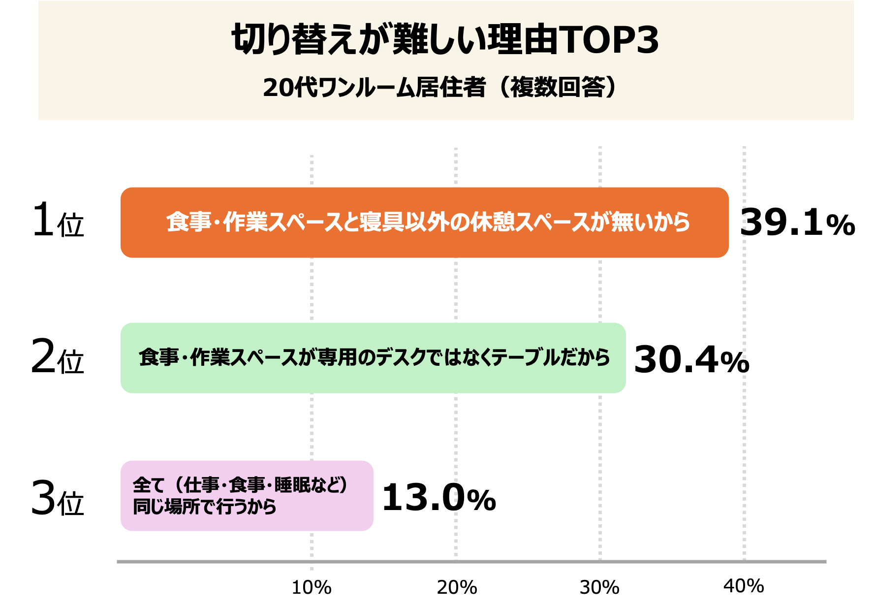 なぜ心のスイッチを切り替えられないのか? その最大の理由は「食事・作業スペースと寝具以外の休憩スペースが無いから」(39.1%)でした。デスク(ON)とベッド(OFF)の中間にあるべき「ニュートラルな場所(ソファー等)」が欠落していることが、気持ちの切り替えを失わせている原因になっていることが推測できます。