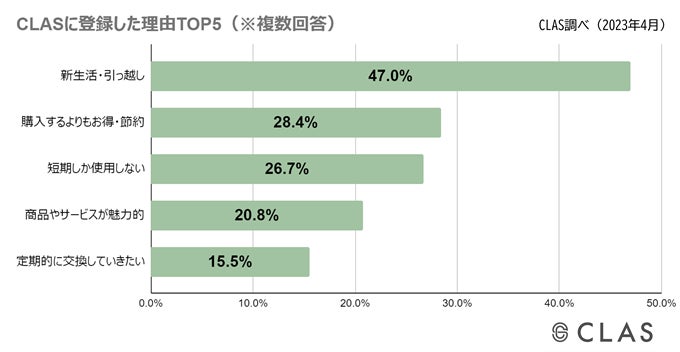 2023年4月に実施したCLAS登録者を対象にしたユーザーアンケートでは、約半数の方が「新生活・引越し」を機にCLASへご登録いただいております。