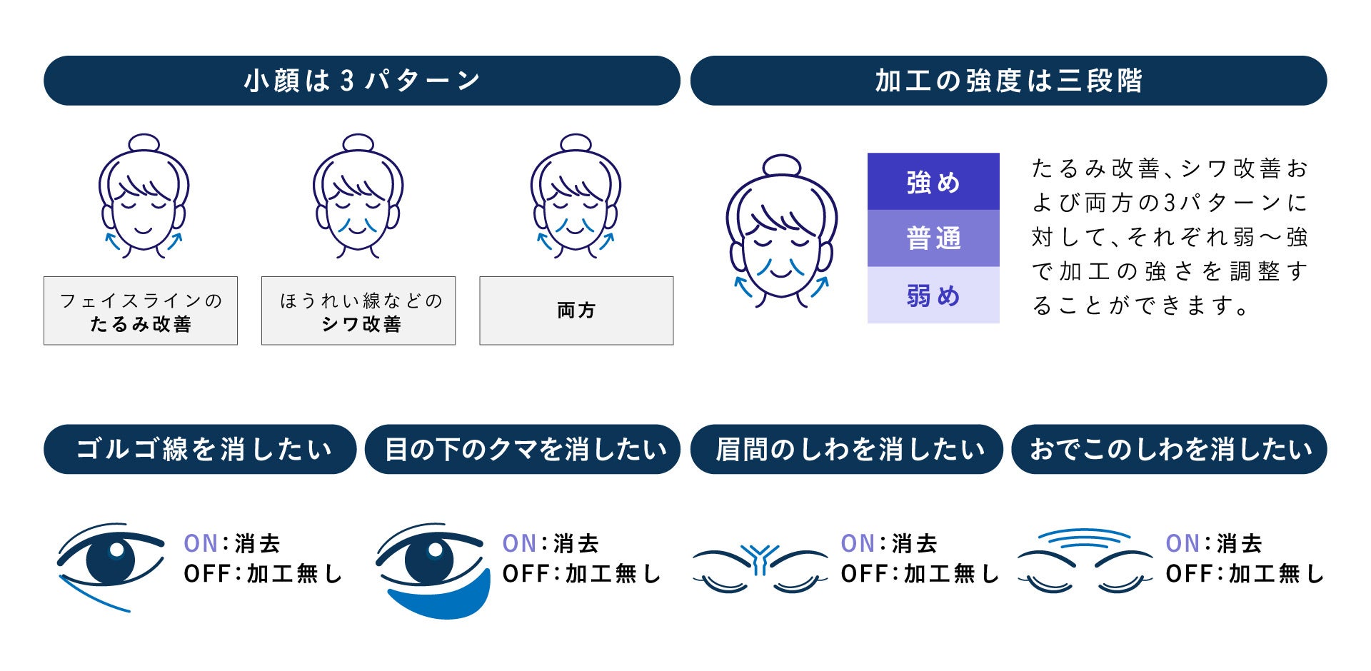 当サービスでは、「糸リフト」「切らない目の下のクマ取り・目の下のたるみ取り」「ボツリヌストキシン注射」「ヒアルロン酸注射」の施術から、一度に複数のシミュレーションを行うことができます。糸リフトはフェイスラインの「たるみ改善」、ほうれい線やマリオネットラインの「シワ改善」、またはその「両方」の3パターンに対して、それぞれリフトアップの強さ(弱め・普通・強め)を選択可能。切らない目の下のクマ取り・目の下のたるみ取りやボツリヌストキシン注射、ヒアルロン酸注射は施術の有無による変化のオンオフを切り替えて選択することで計144種類のシミュレーションを行うことができます。生成数は、大手美容外科が提供する来院せず使用可能なAIシミュレーターの中で最多です。