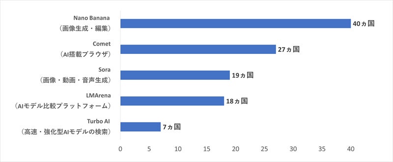 特に画像の生成や編集を可能とする「Nano Banana」を示すキーワードは、今回の調査対象である40カ国・地域すべての検索キーワードランキングにランクインしました。その他、動画の生成を可能とする「Sora」を示すキーワードが19カ国、AIモデルごとに画像の比較などを可能とする「LMArena」は18カ国・地域の検索キーワードランキングにそれぞれランクインしました。