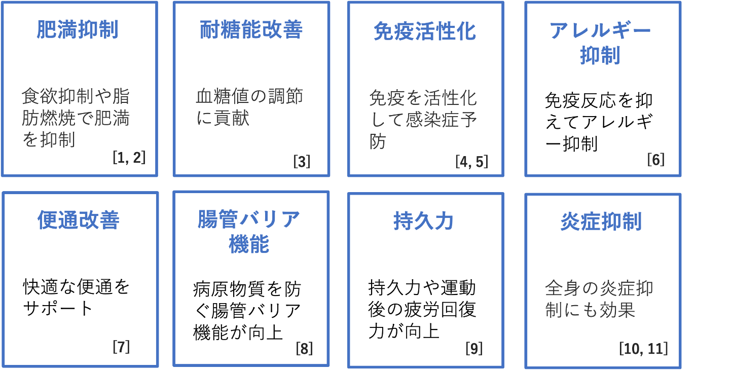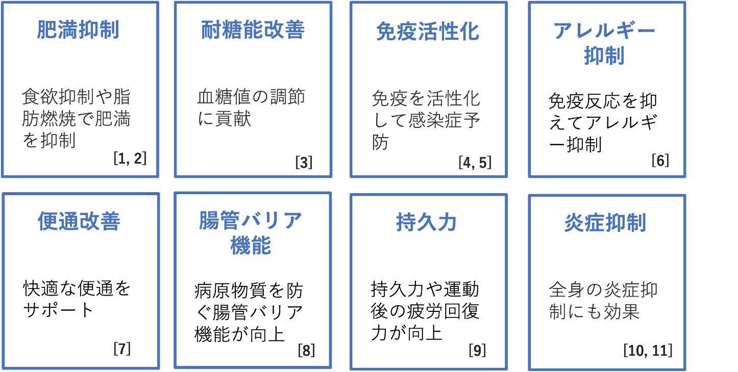 「短鎖脂肪酸」とは、腸内細菌が食物繊維やオリゴ糖を分解して産生する主要な代謝物質の一つ。主に、酢酸、プロピオン酸、酪酸の3つがあります。最新の研究では「便通改善」「免疫機能の増強」「肥満抑制」「アレルギー抑制」「持久力の向上」など、短鎖脂肪酸が持つ多彩な健康機能が明らかになっています。さらに、健康な人において、現在まで悪影響が報告されていないことから、まさに“スーパー物質”と呼ばれる存在です。そのため、生活者が「短鎖脂肪酸の産生」を意識することで、結果として医療費の削減や健康寿命の延伸といった社会的課題への貢献も期待できます。