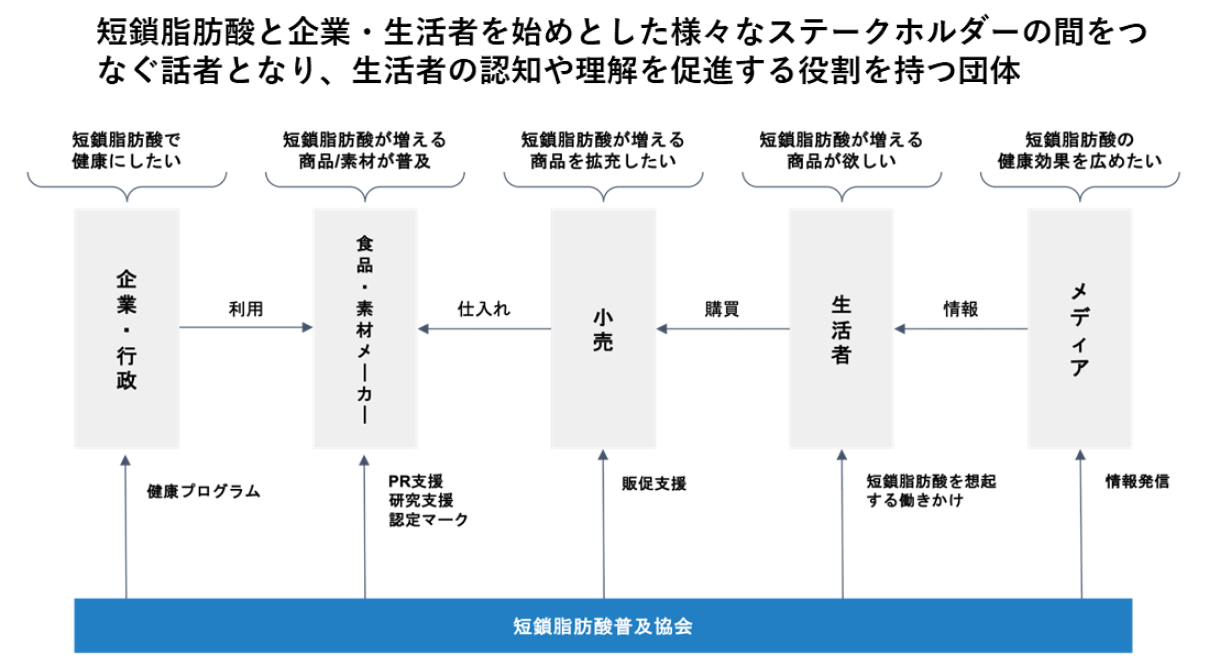 短鎖脂肪酸普及協会は「短鎖脂肪酸」の認知向上・理解促進のため、企業や生活者をはじめとした様々なステークホルダーとの架け橋となることで短鎖脂肪酸の普及により「腸から新たな健康リテラシー構築」を目指します。これまでの腸活をアップデートし、「腸活の新指標=短鎖脂肪酸」という生活者認知をつくっていきます。
