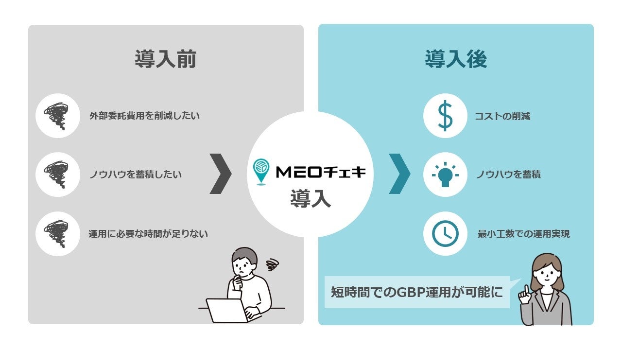 しかし、MEOチェキを導入することで、ノウハウが蓄積できない課題を解決し、MEO対策の内製化に成功いたしました。