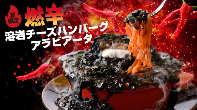 【夏は燃辛爽快♡】夏の溶岩パスタは「黒×赤」のコントラストが眩しい衝撃のビジュアル!夏限定『燃辛溶岩チーズハンバーグアラビアータ』が8月1日(火)新登場!