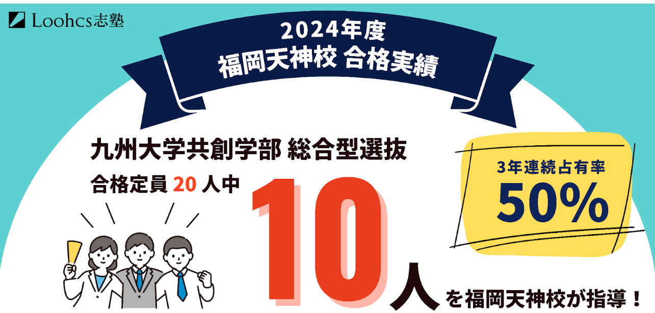 九州大学共創学部の総合型選抜は受験生から人気があり、その倍率は毎年約6〜7倍、そして年々総合型選抜の難易度も上がっています。そんな中、Loohcs志塾福岡校舎では、2024年度九州大学共創学部(総合型選抜)合格者のうち、合格・福岡天神校主催の共創模試受験者から10名が合格者(当塾の合格者も含む)を輩出しました。昨年度は合格定員20名中10人、一昨年度も合格定員21名中12人、を福岡天神校が指導しており、3年連続で占有率50%という圧倒的な合格実績を残しました。