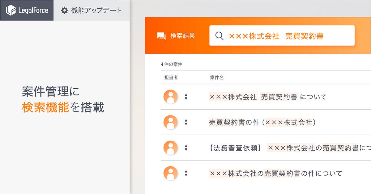 AI契約審査プラットフォーム「LegalForce」 を提供する株式会社LegalForce(本社:東京都江東区 代表取締役CEO:角田望、以下LegalForce)は、契約業務における案件依頼の受付に対応する「案件管理」機能に検索機能を搭載しました。これにより、案件管理機能の利便性向上と、法務内のナレッジ活用を支援します。