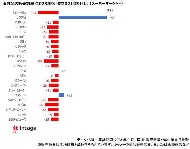 今年9月と、多くの商品に値上がりが波及する前の2年前の同月を比べるとキャノーラ油が41%減と目を引きます。その流出分の一部がサラダ油に流れ込み97%増と大幅に増加していました。またマーガリンの23%、砂糖の20%を始め、多くの調味料で2ケタの減少が見られていました。