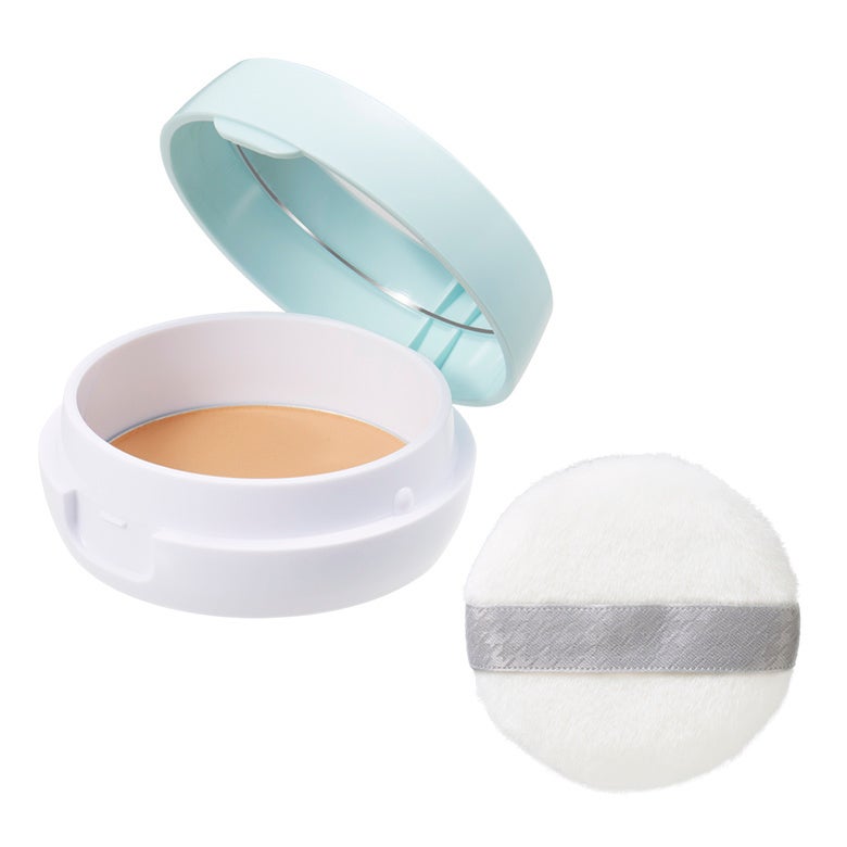 化粧下地のあと、パフに適量をとり、肌を軽くおさえるようにつけます。