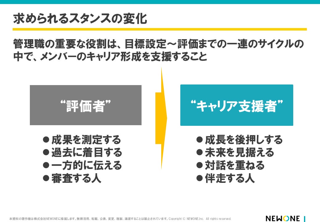 そこで、NEWONEは管理職の役割を「評価者」から「キャリア支援者」へと転換するためのプログラムを開発しました。
