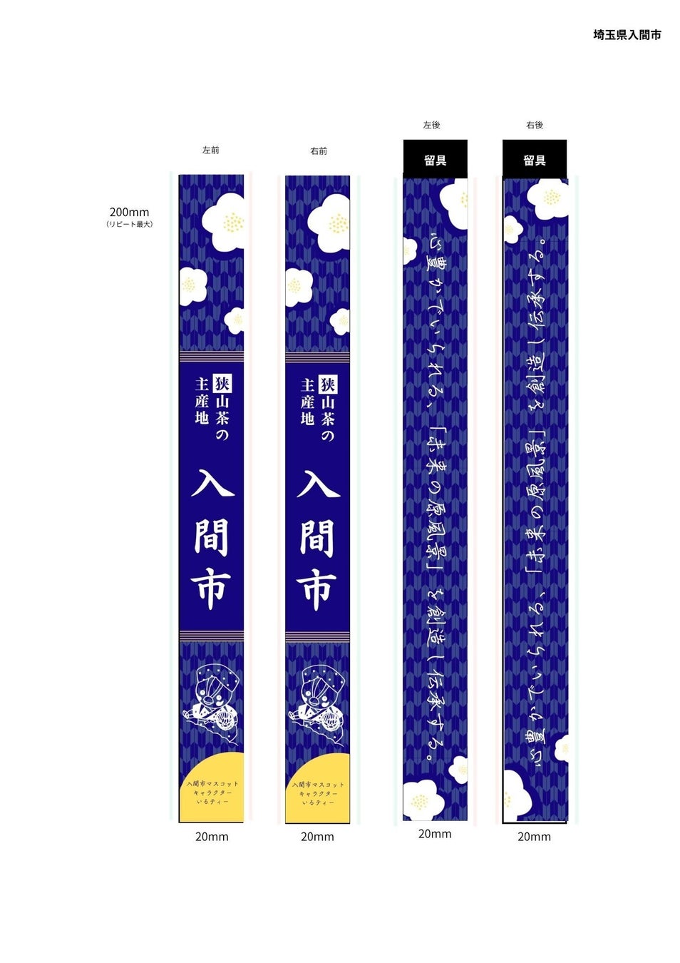 限られた20mmの幅には、日本の伝統文様「矢絣(やがすり)」や茶の花、市のマスコットキャラクター「いるティー」、そして市のパーパス(心豊かでいられる、「未来の原風景」を創造し伝承する。)がデザインされています。