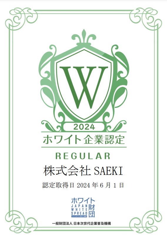 株式会社SAEKI様が、一般財団法人日本次世代企業普及機構(通称:ホワイト財団)が運営する「ホワイト企業認定 レギュラーランク」を取得しましたことをお知らせいたします。