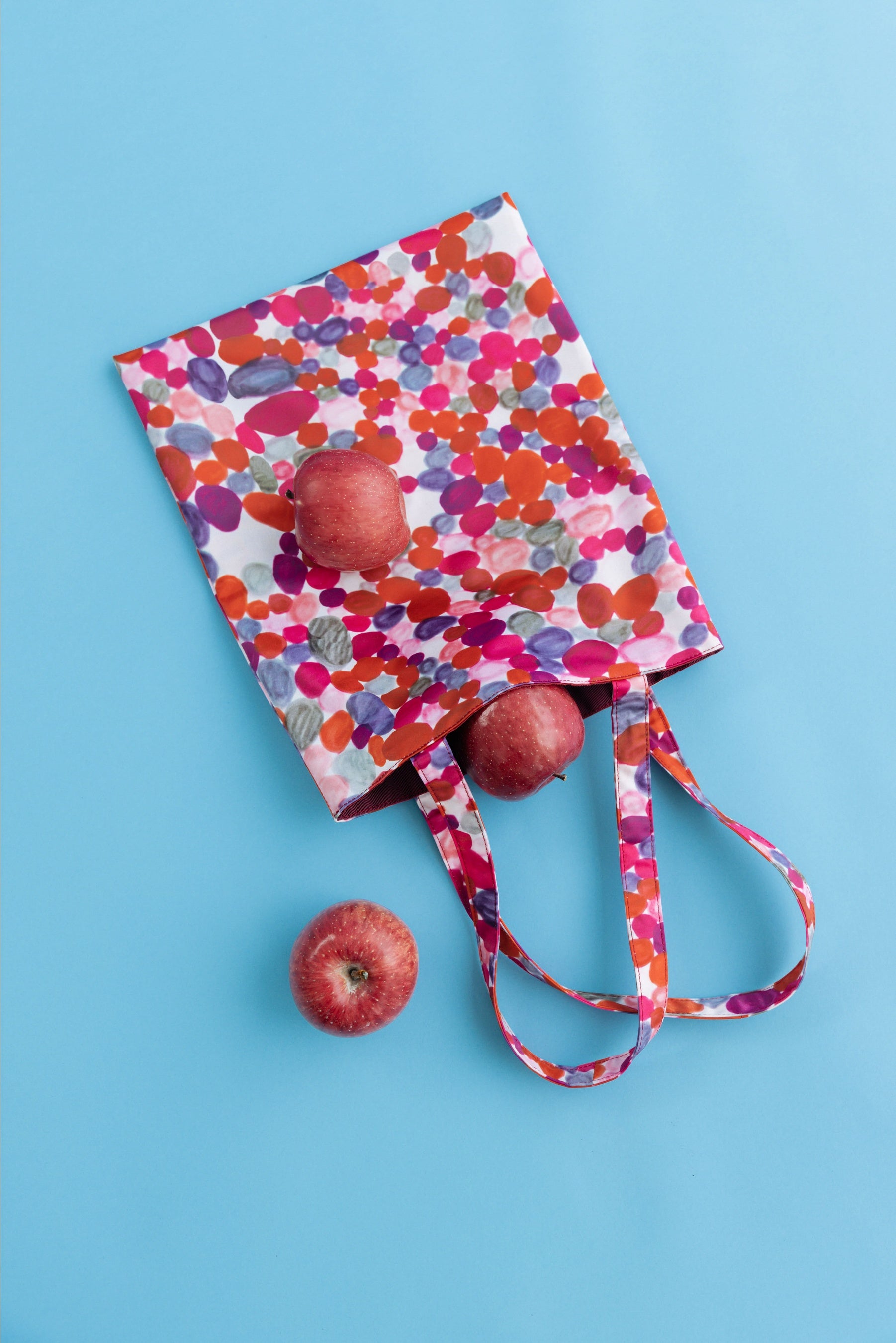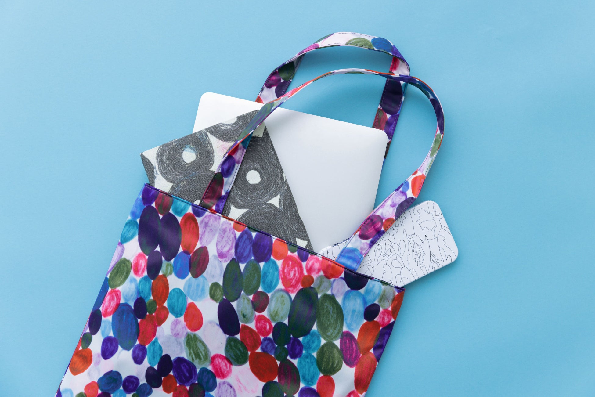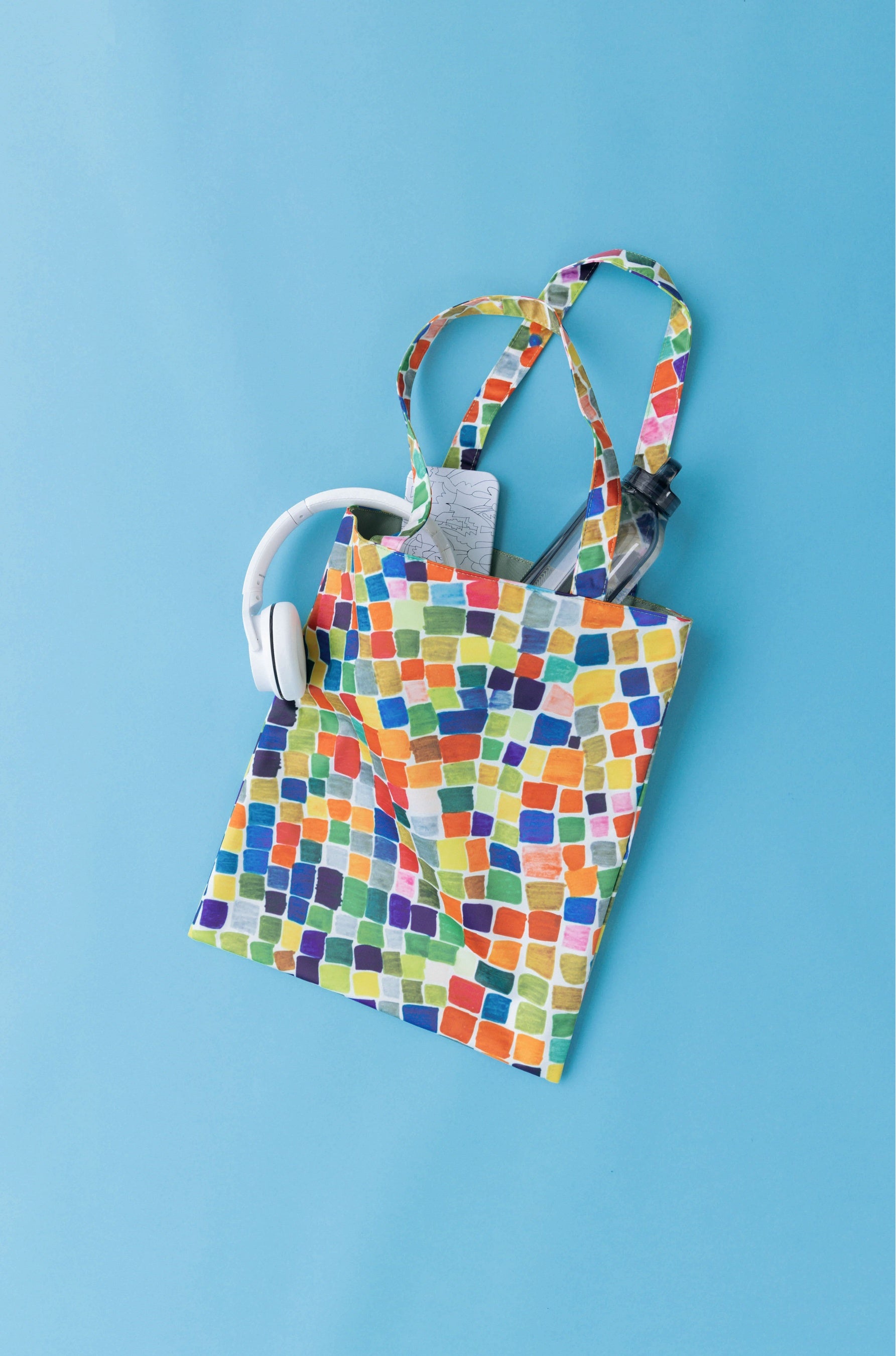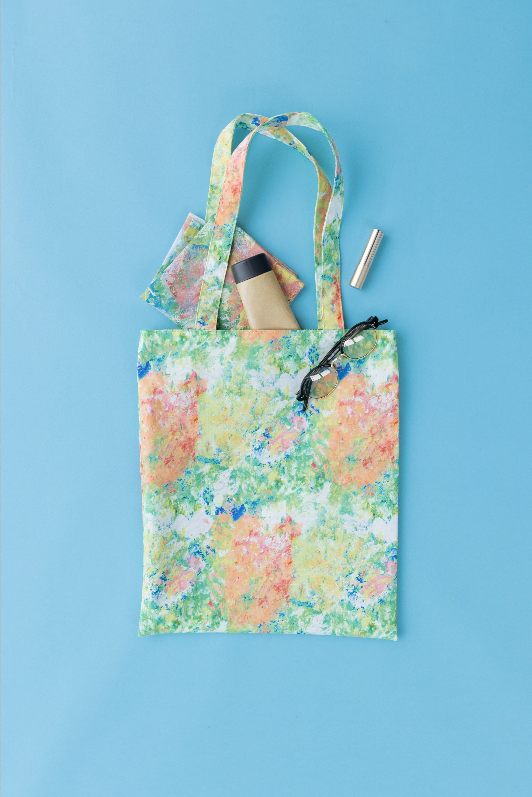 ワンピースに使用した生地を使用したフラットトートバッグ。生地はPVC加工を施しているため型崩れしにくい素材です。A4サイズが入る容量で、内装にはミニポケットを搭載。鮮やかなカラーで、メインバッグとしてもサブバッグとしてもデイリーに活躍します。