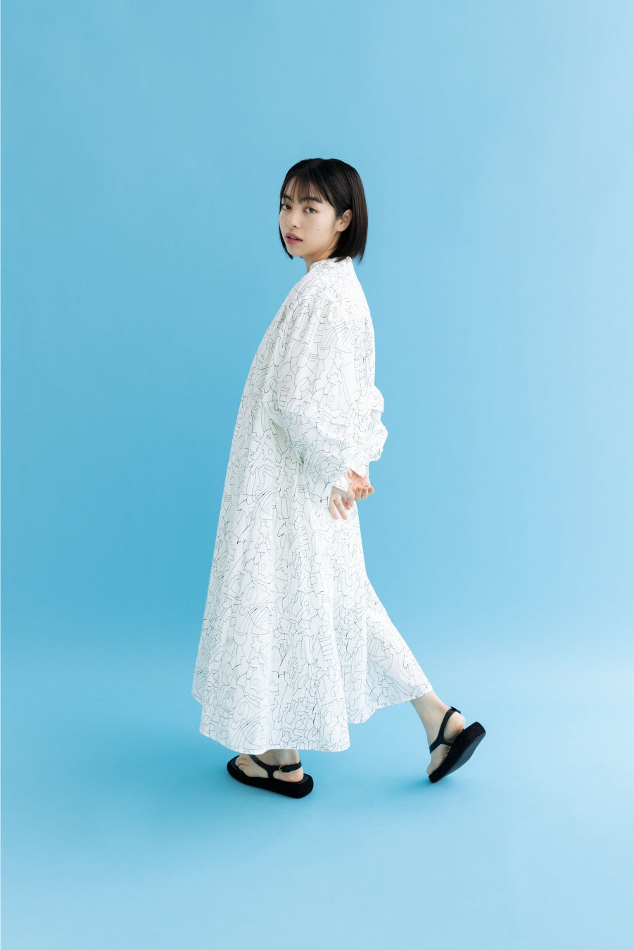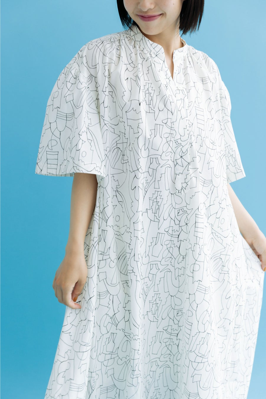 シワになりにくいポリエステルコットンを使用し、ドラマチックなボリュームとシンプルなディティールが印象的なドレス。 立体的なカッティングで仕上げたパフスリーブは取り外し可能で長いシーズン着用できる、2wayアイテムです。 ハリのあるAラインシルエットで一枚でもサマになります。秋冬はニットを合わせたレイヤードスタイルもおすすめです。