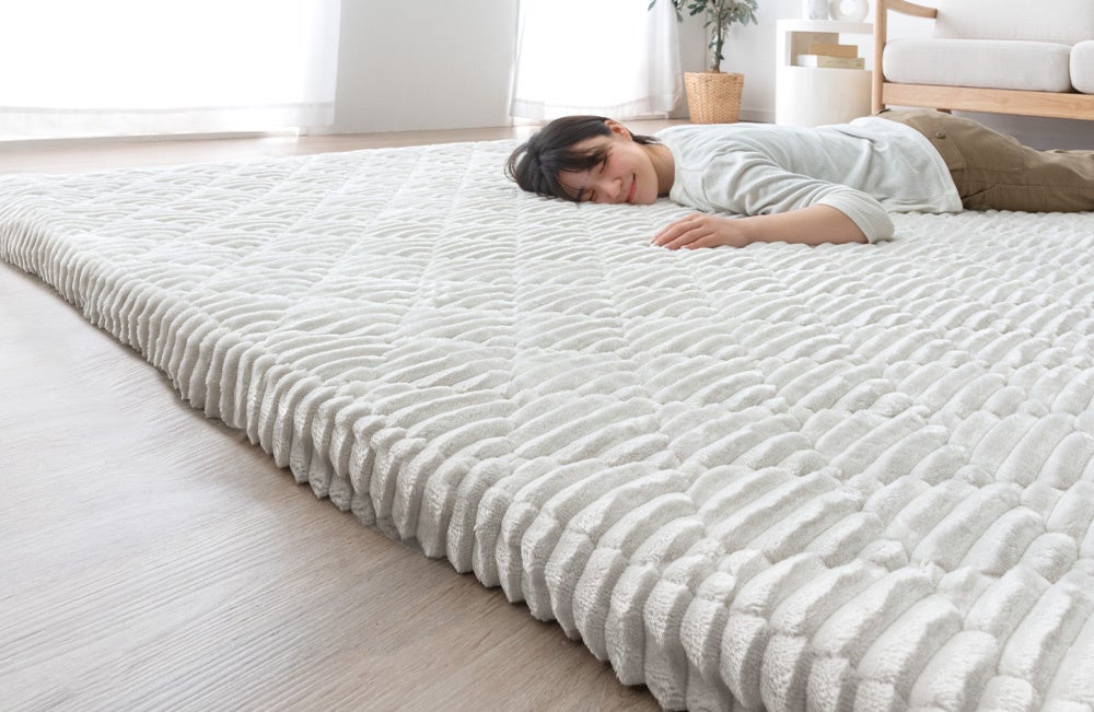 人気の極厚カバーリングラグ50mmに暑さを和らぐ接触冷感タイプを発売開始!暑い日でもリビングで心地よく寝転がれるふかふかな弾力感とひんやり感をお届け!
