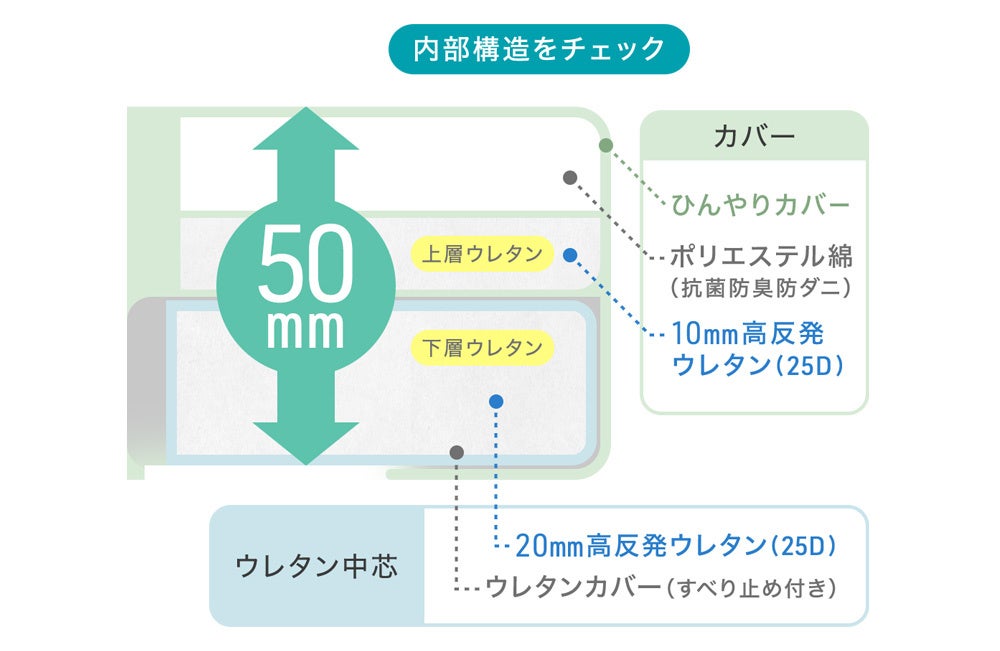 <カバー> 表地:ナイロン100%(220g/㎡) 中材:ポリエステル綿(200g/㎡、抗菌防臭防ダニ加工)、25D高反発ウレタンフォーム 10mm 裏地:ポリエステル100%(75g/㎡、ピーチスキン) <中芯> 側地:ポリエステル100%(両面滑り止め加工) 中材:25D高反発ウレタンフォーム 20mm |