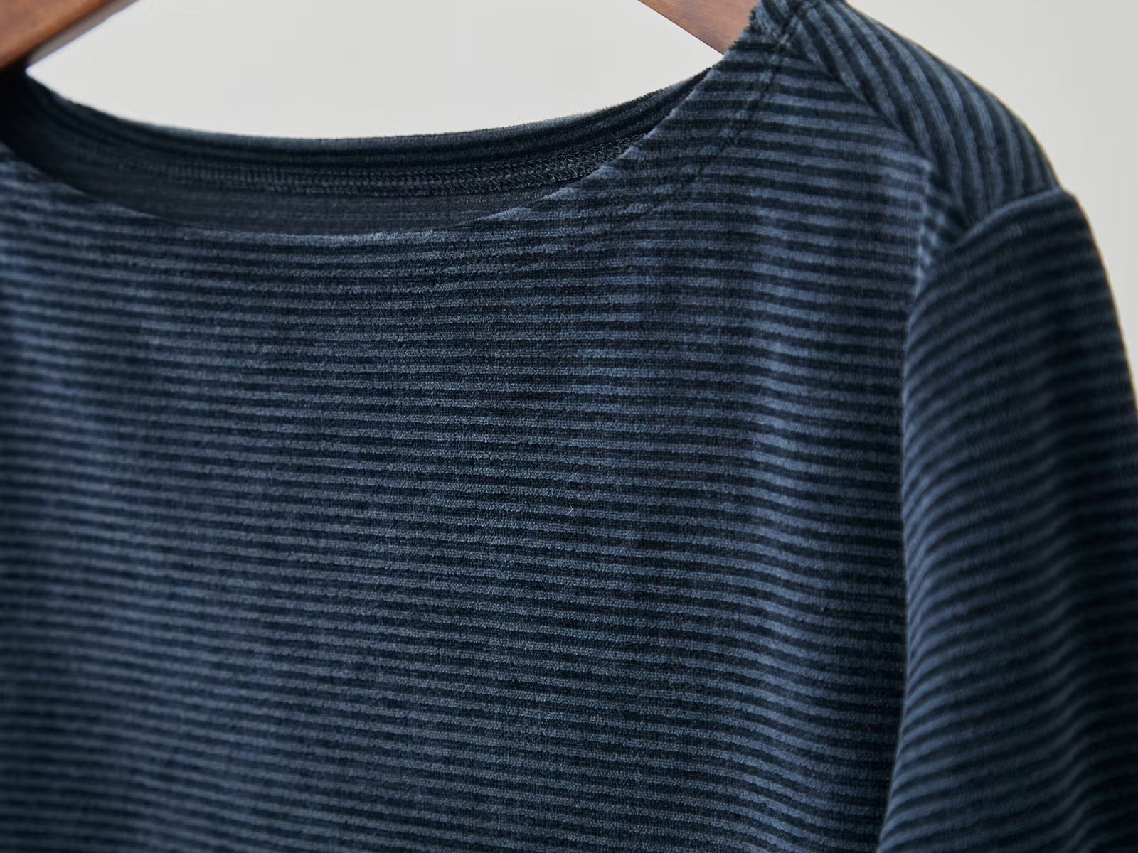 夏も秋も。エアリーなベロアTシャツ登場。光沢と軽やかさをまとう、「コットンベロア5分袖Tシャツ」