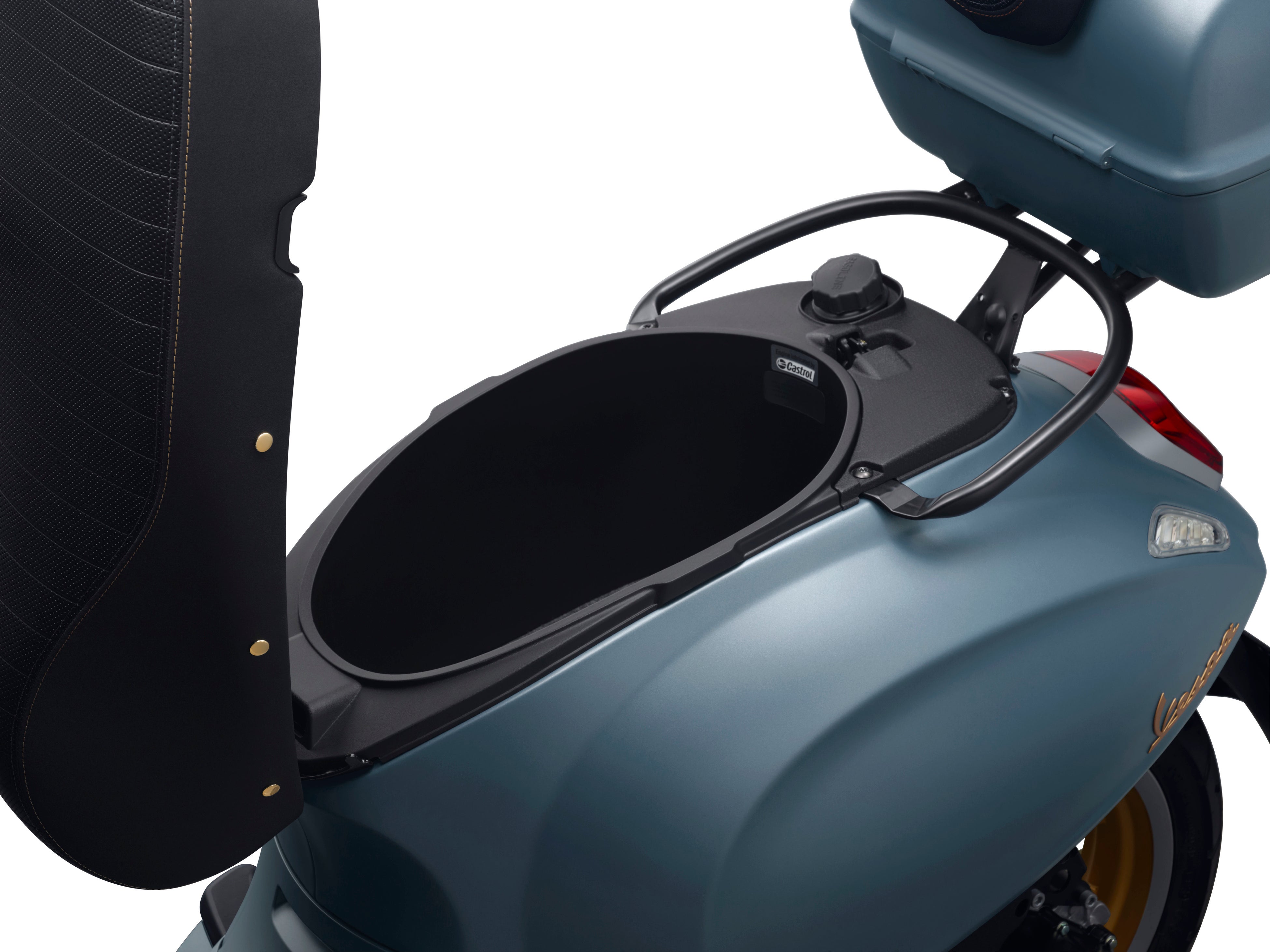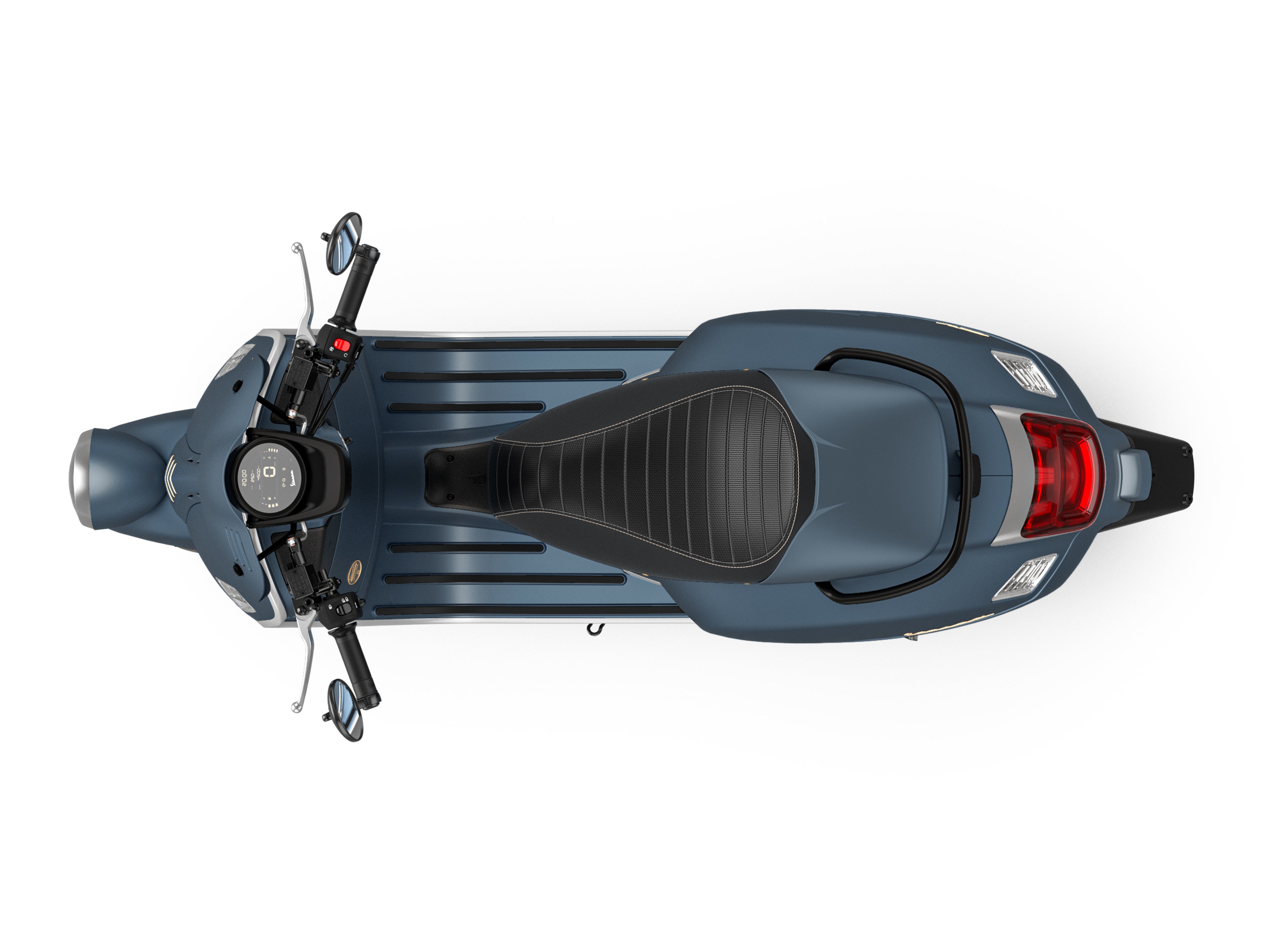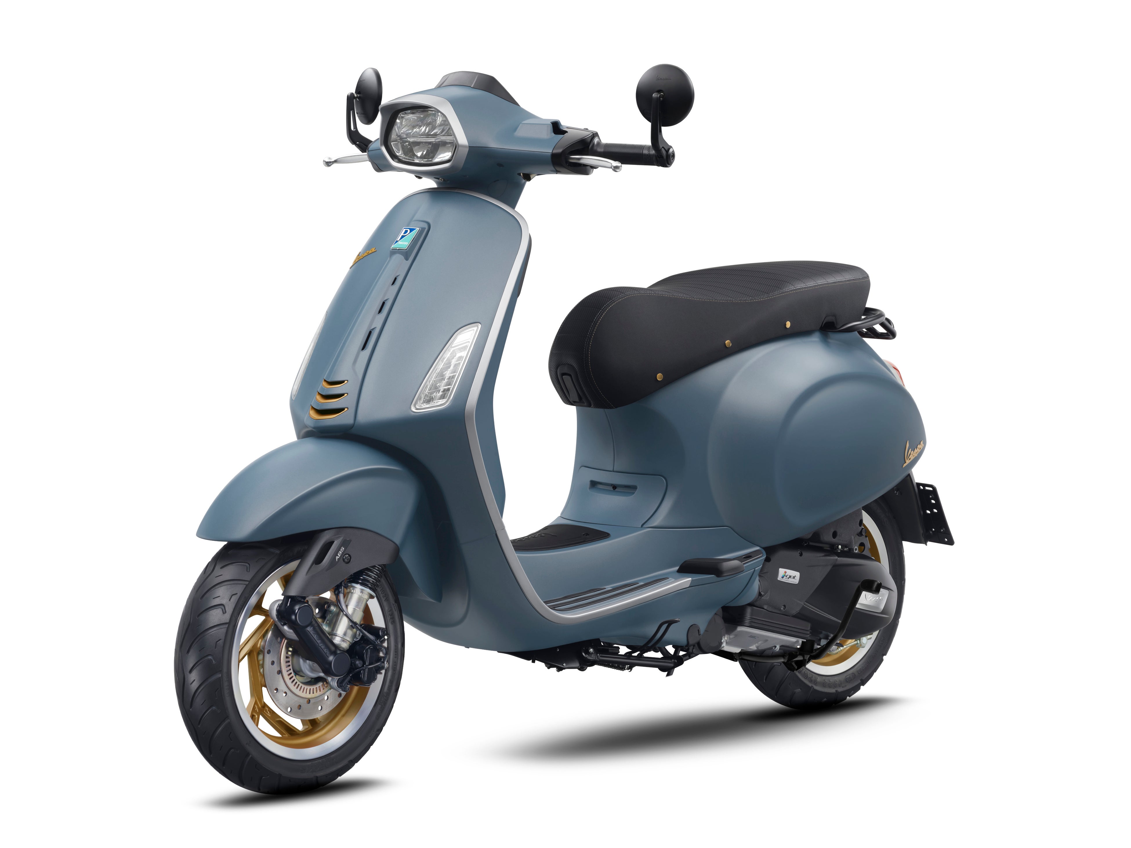 シートにはダブルステッチが施され、、2種類の材質を採用する表皮は磨かれた真鍮リベットの装飾など、そのきめ細やかな仕上げには伝統へのさらなる敬意を表しています。そしてGTVにはボディーと同色のシングルシートフェアリングを標準装備し、Vespaのレーシングモデルの外観を再現した独特なスタイリングを実現しています。さらにこれらの特別仕様車は、マットブラックで引き締まった数々のディティール同様に、マットブラック仕上げのバーエンドミラーによってスポーティな外観を強調します。