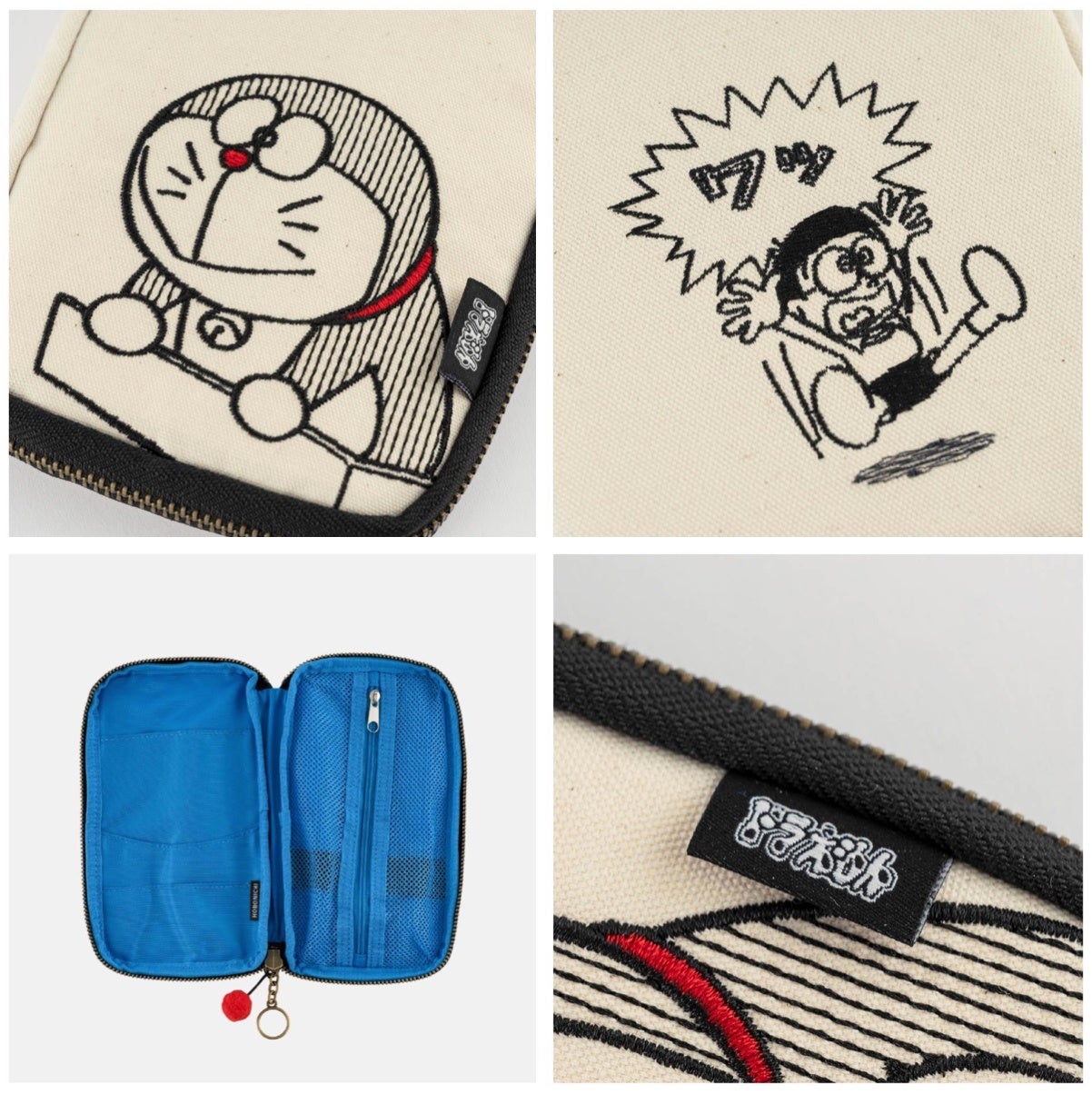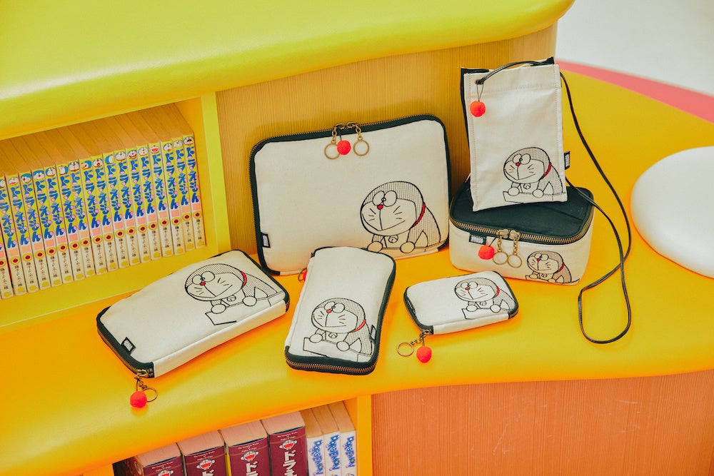 ひきだしポーチとは、好きなものや大事なものをつめこんだ、じぶんだけの「ひきだし」をまるごと持ち歩けるようなポーチ。文具入れや趣味の道具入れ、お財布代わりになるのはもちろん、通帳や印鑑、 カードやパスポート、病院の診察券やお薬手帳といった大切なものをまとめておくのにぴったりです。バッグインバッグのように使っても、おうちに置いて収納ポーチとして使っても便利です。今回新登場するデザインは、タイムマシンに乗って22世紀からやってきたドラえもん。外側はドラえもんが初登場するシーンを刺繍で再現し、白の帆布素材と黒のファスナーでシンプルに仕上げました。遊び心も忘れず、内側は鮮やかなドラえもんカラーに。引き手部分にはドラえもんのしっぽのような丸いチャームもつけました。黒字に白文字で「ドラえもん」のロゴが入ったタグもポイントです。