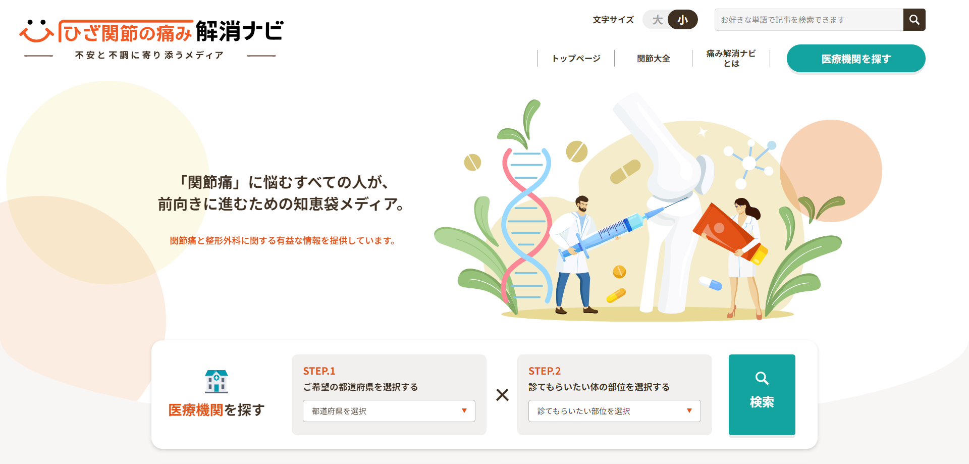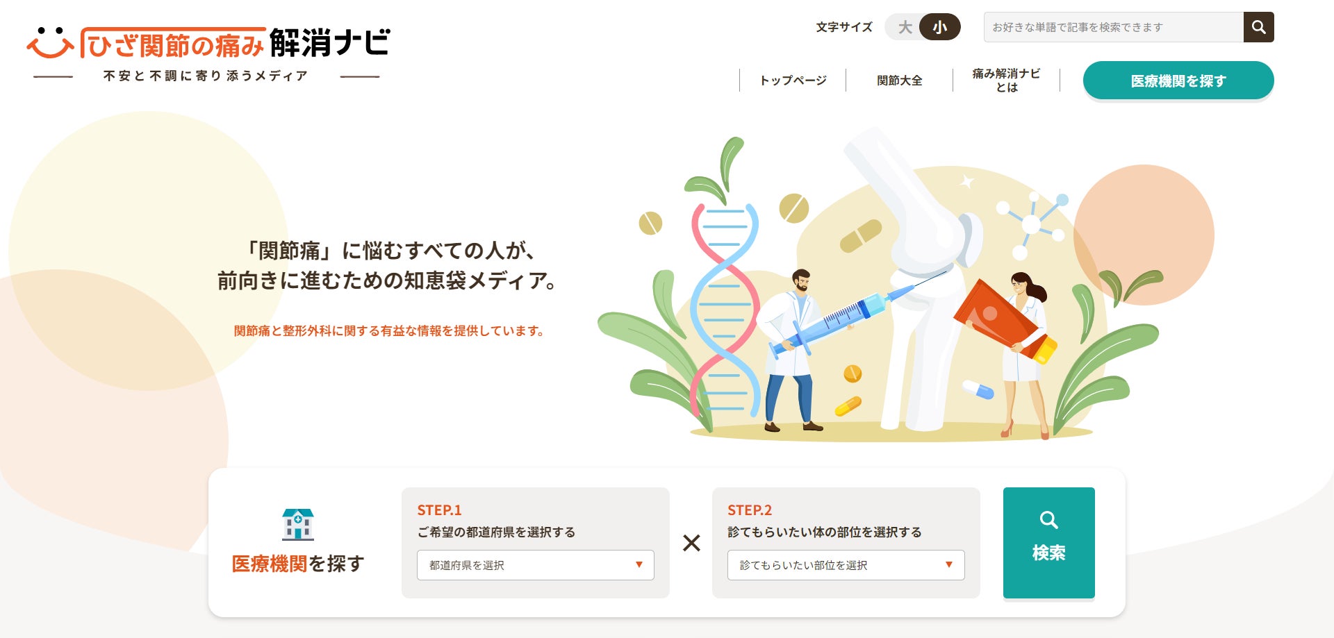 【ひざ関節の痛み解消ナビ】は前述の社会的な背景を踏まえ、課題解決の一助になるよう「関節痛に悩むすべての人が前向きに進むための知恵袋メディア」をコンセプトに開発、ローンチしました。