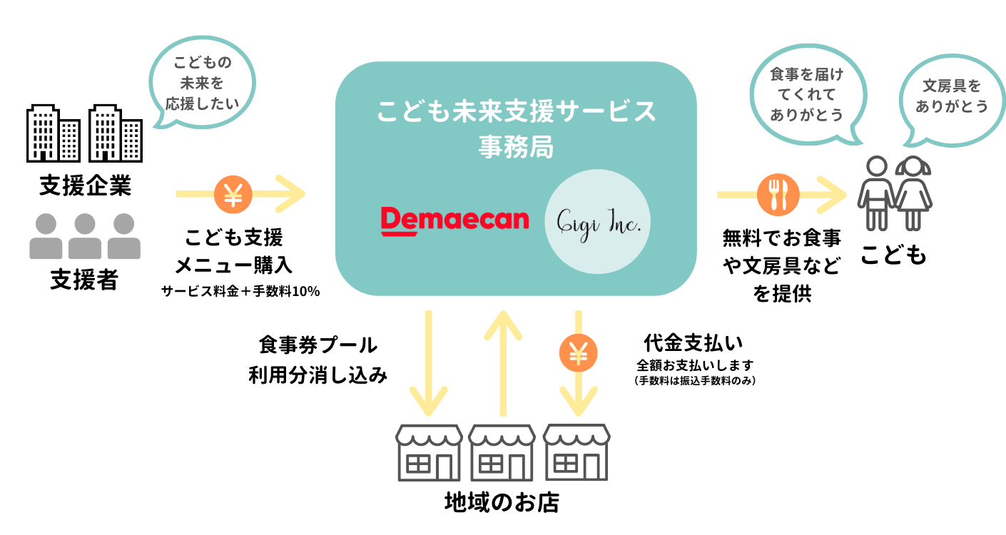 これらの課題を解決するため、当社の「街ごとこども食堂」の仕組みを拡大した「こども未来支援サービス」を、出前館と共同で開始します。