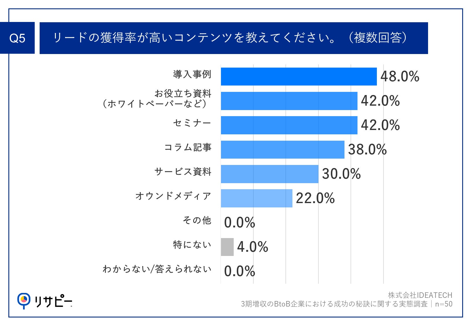 Q4で「非常に関係がある」「やや関係がある」と回答した方に、「Q5.リードの獲得率が高いコンテンツを教えてください。(複数回答)」(n=50)と質問したところ、「導入事例」が48.0%、「お役立ち資料(ホワイトペーパーなど)」42.0%、「セミナー」が42.0%という回答となりました。