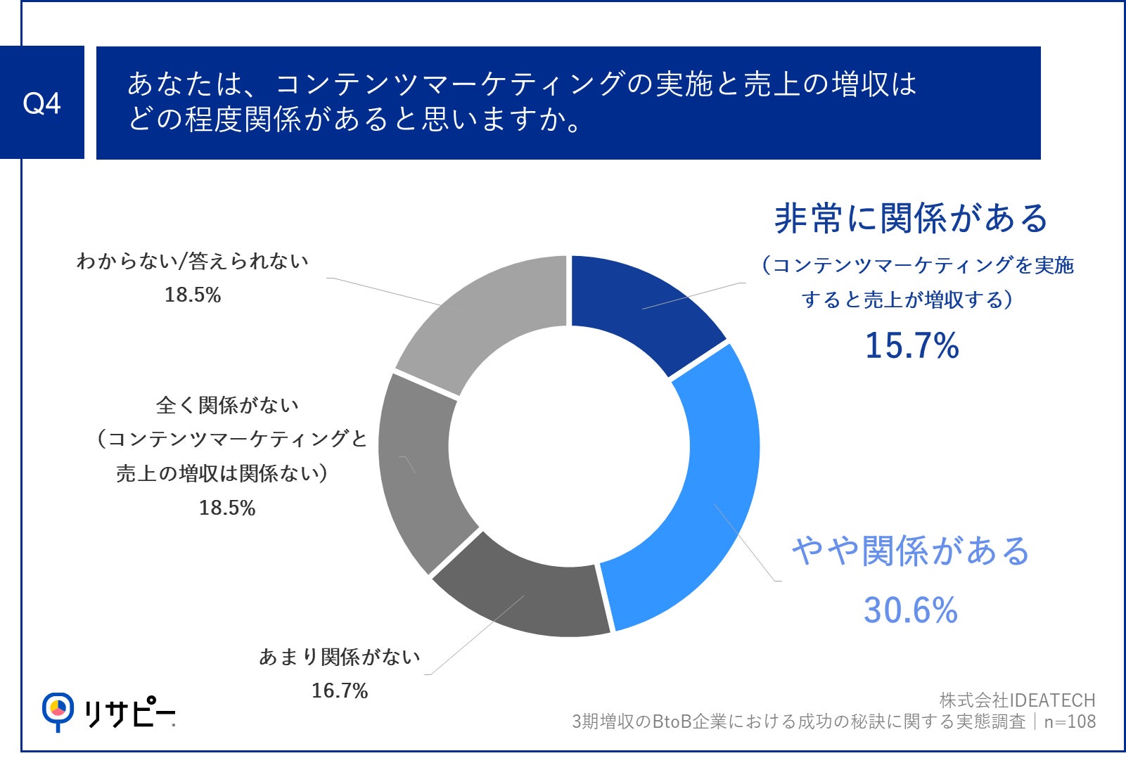 「Q4.あなたは、コンテンツマーケティングの実施と売上の増収はどの程度関係があると思いますか。」(n=108)と質問したところ、「非常に関係がある(コンテンツマーケティングを実施すると売上が増収する)」が15.7%、「やや関係がある」が30.6%という回答となりました。
