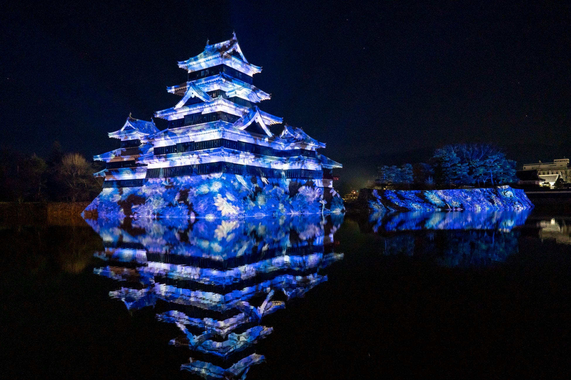 【内容】 現存国宝5天守の一つで五重六階の天守の中で最古の国宝 松本城の天守や石垣などに、豪壮な天守を築いた城主・石川数正が描かれた屏風絵が躍動するデジタルアニメーションや雪の結晶や氷などをモチーフとしたデジタルアート、北アルプスに美しく咲き誇る百花繚乱の花々など、ダイナミックで幻想的なプロジェクションマッピング映像を投影します。