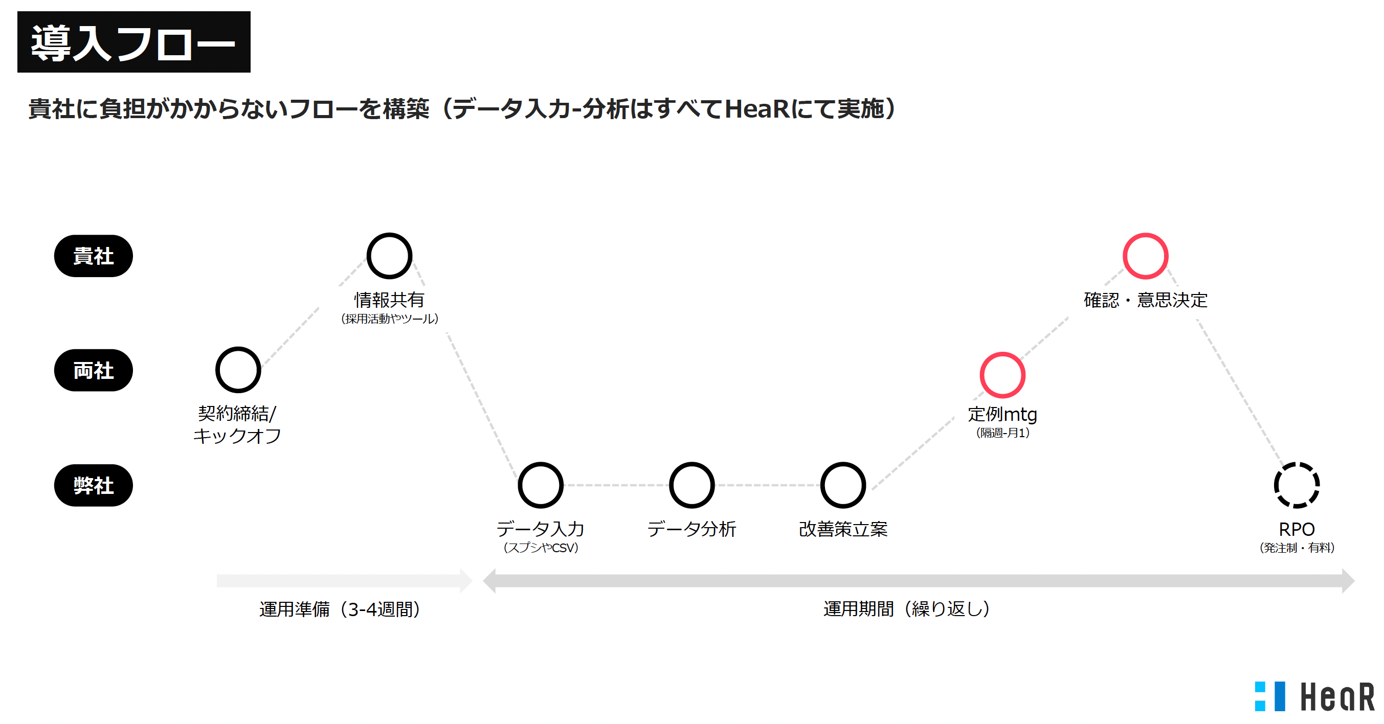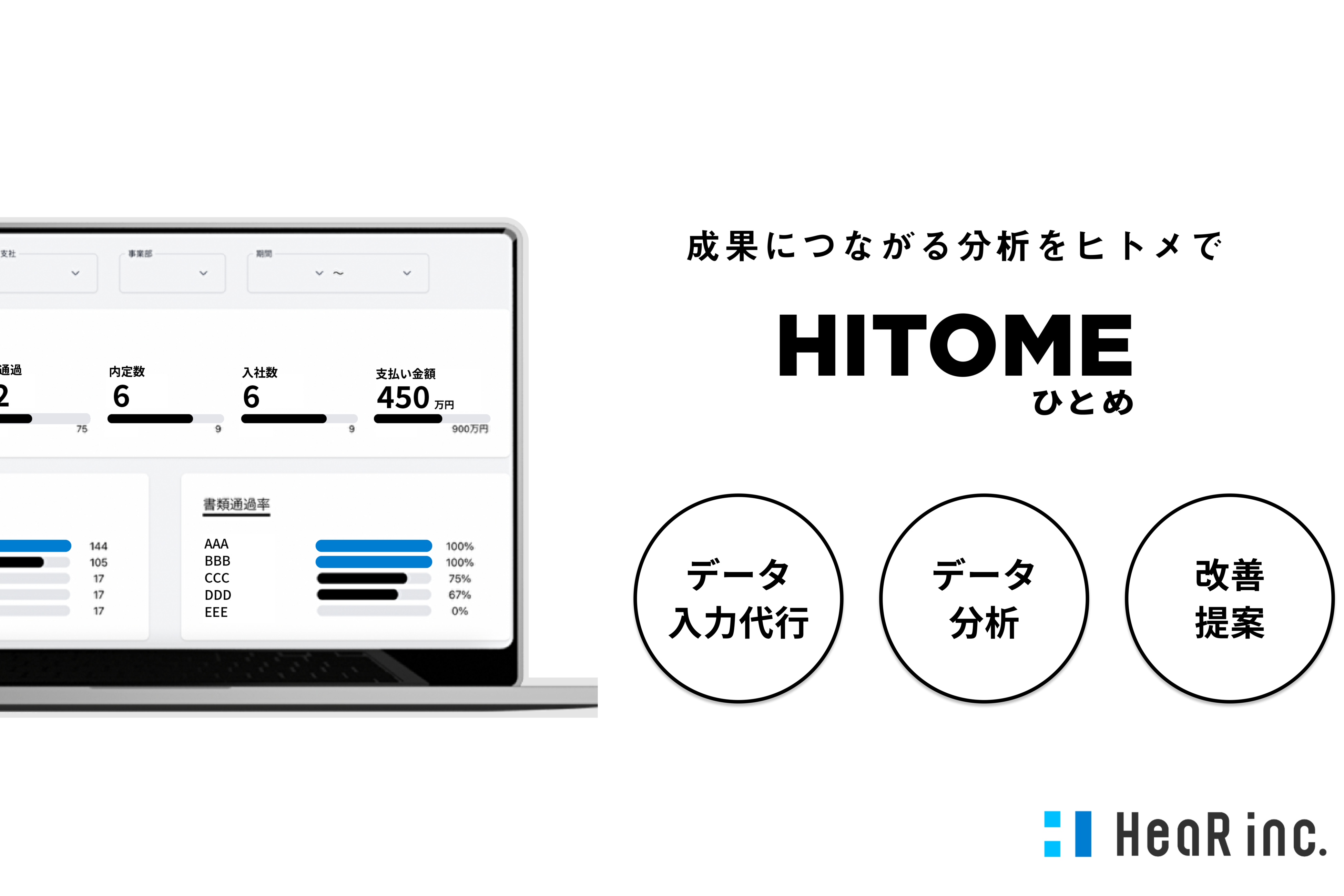 「HITOME」では採用全体におけるデータ入力から分析、改善策の立案までをすべて代行/ツール化/支援することで、企業における採用活動の意思決定をサポートし、日本の採用担当の労働生産性向上に寄与します。
