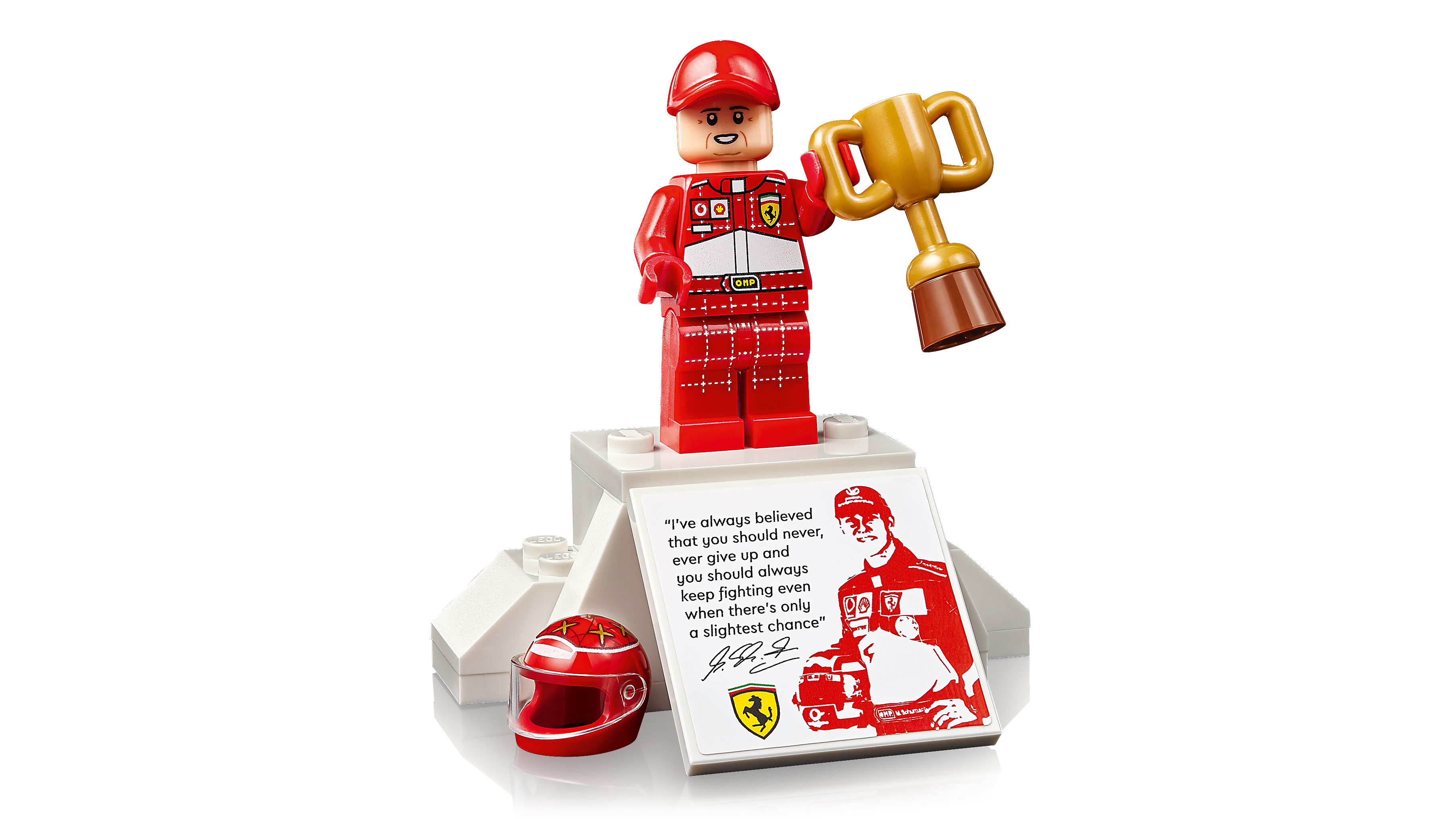 また、7度のF1世界チャンピオンに輝いた「皇帝」ミハエル・シューマッハのレゴ®ミニフィギュアが付属し、専用のドライバーヘルメットや優勝トロフィー、そして表彰台のパーツとともに、劇的な勝利のシーンを自宅で再現することも可能です。さらに、車両データを記載した専用ディスプレイスタンドに加え、レゴ®ミニフィギュア用にはシューマッハの写真と名言が添えられた特別な表彰台型スタンドも付属し、完成した後はディスプレイとしても楽しめます。