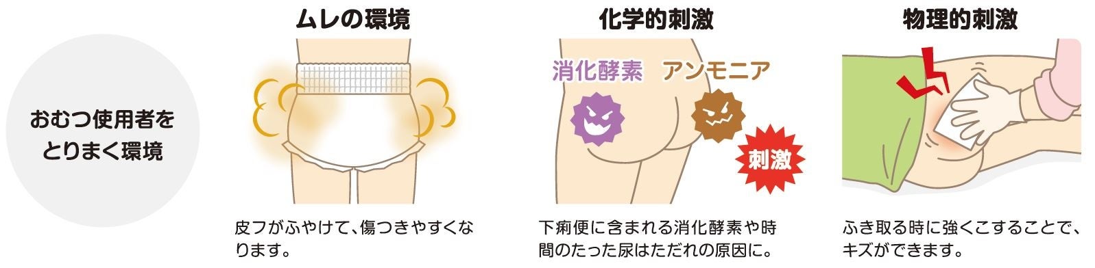 おむつ使用者のおしりの環境は、おむつをしていることによりムレていることが多く、皮フがふやけて、傷つきやすくなっています。下痢をしている方は、下痢便に含まれる消化酵素や時間のたった尿で、皮フがただれやすくなっています。また、おしりの汚れをふき取る時も、強くこすることでキズができやすくなっています。