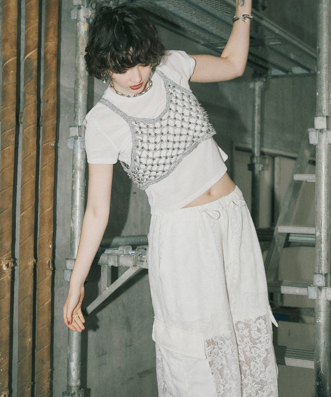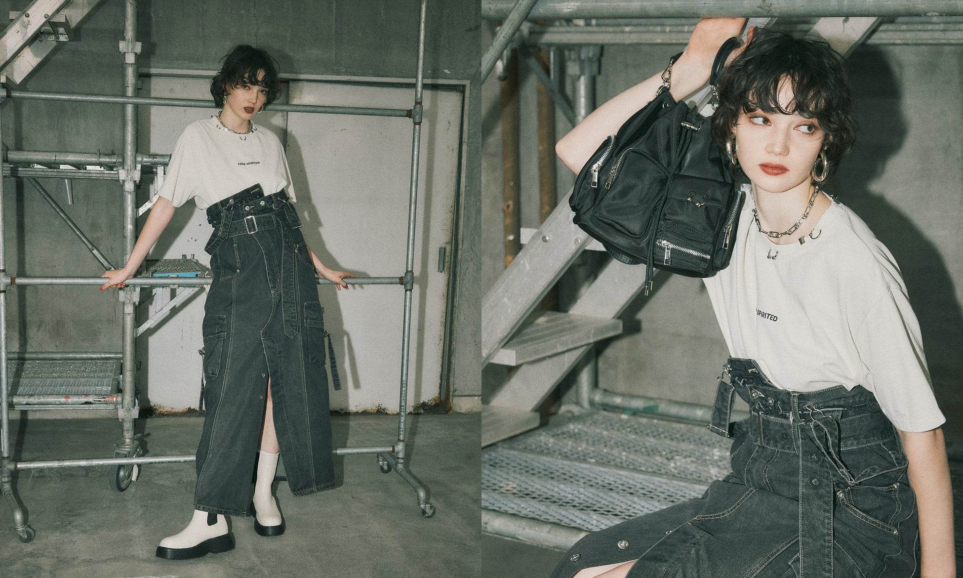 ボディピアスT ¥7,590(tax in)/カーゴデニムジャンスカ ¥14,839(tax in)