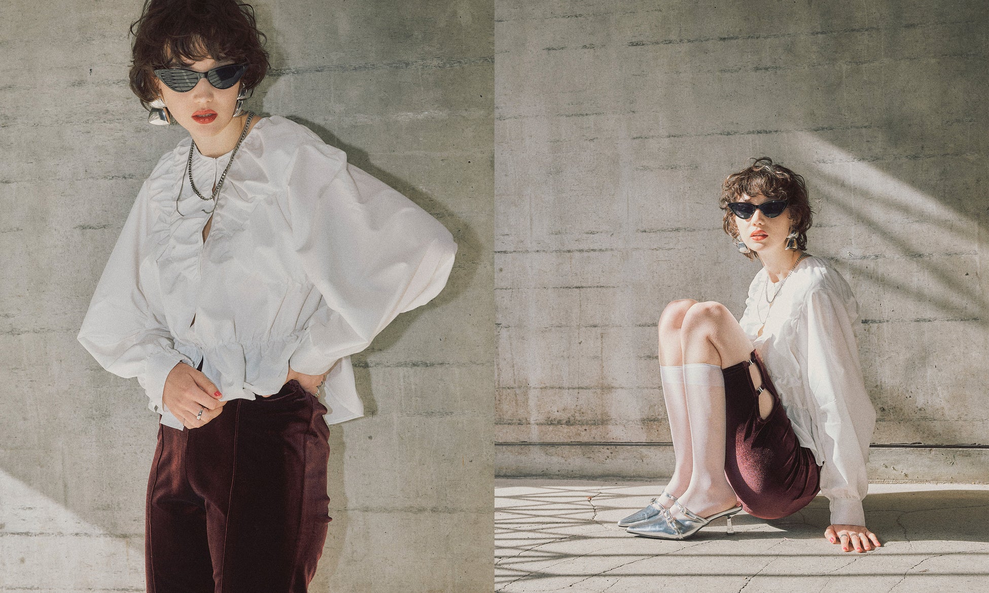 シャーリングブラウス ¥13,090(tax in)/ベロアハーフレギンス ¥7,590(tax in)