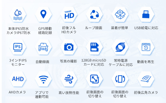 常時電源ケーブル&USBケーブルから給電可能、GPS移動経路記録、ループ録画、Gセンサー、音声録音、前後同時録画などの機能に対応し、いつでも安心・便利なドライブを堪能できます!