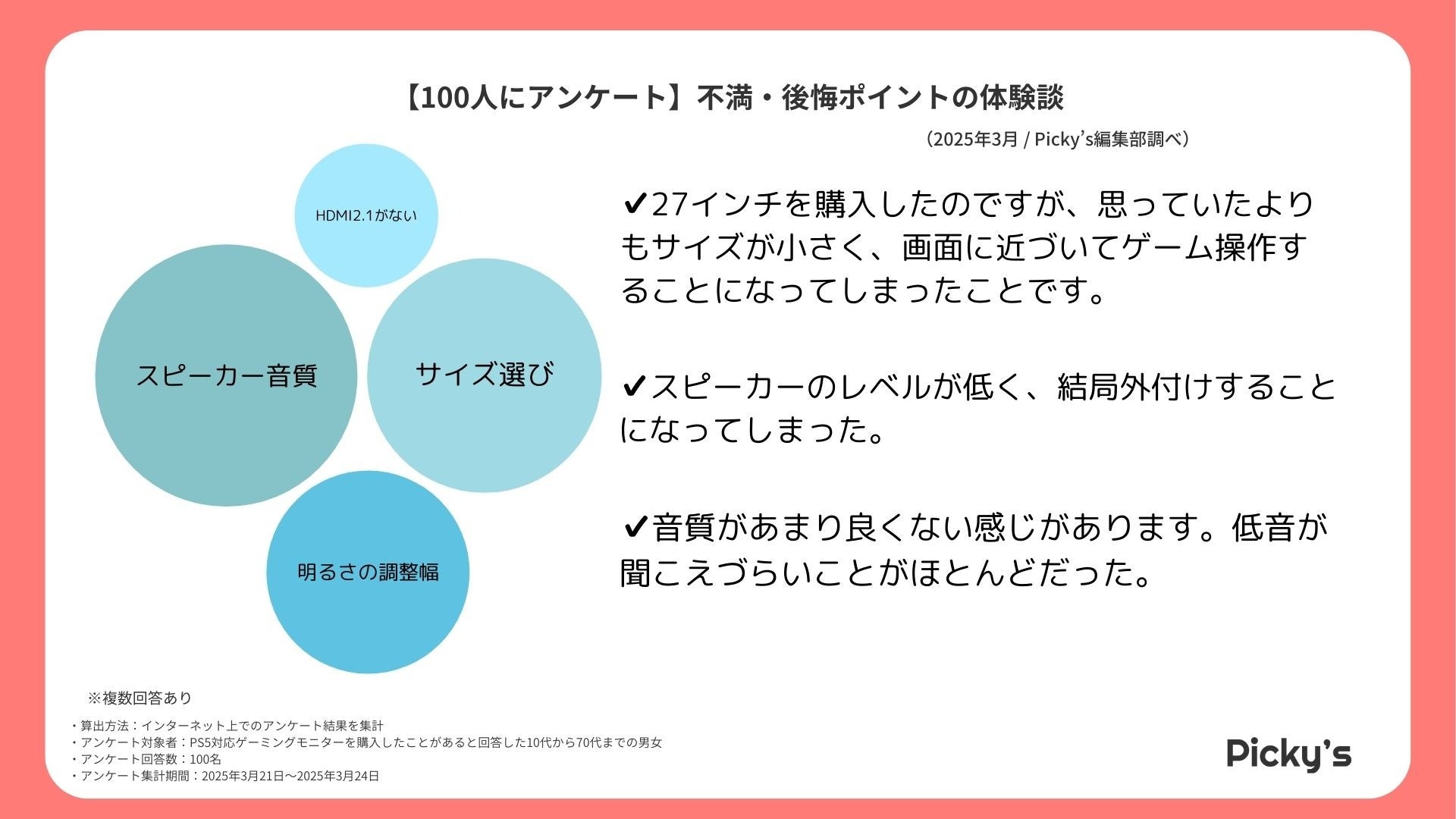 また「サイズは大きければいいとは限らない」「価格だけで選ばないこと」といったバランス重視の声もあり、スペック偏重にならないよう注意喚起するコメントも印象的でした。これからPS5用モニターを購入する人にとって非常に実用的なヒントが詰まっています。