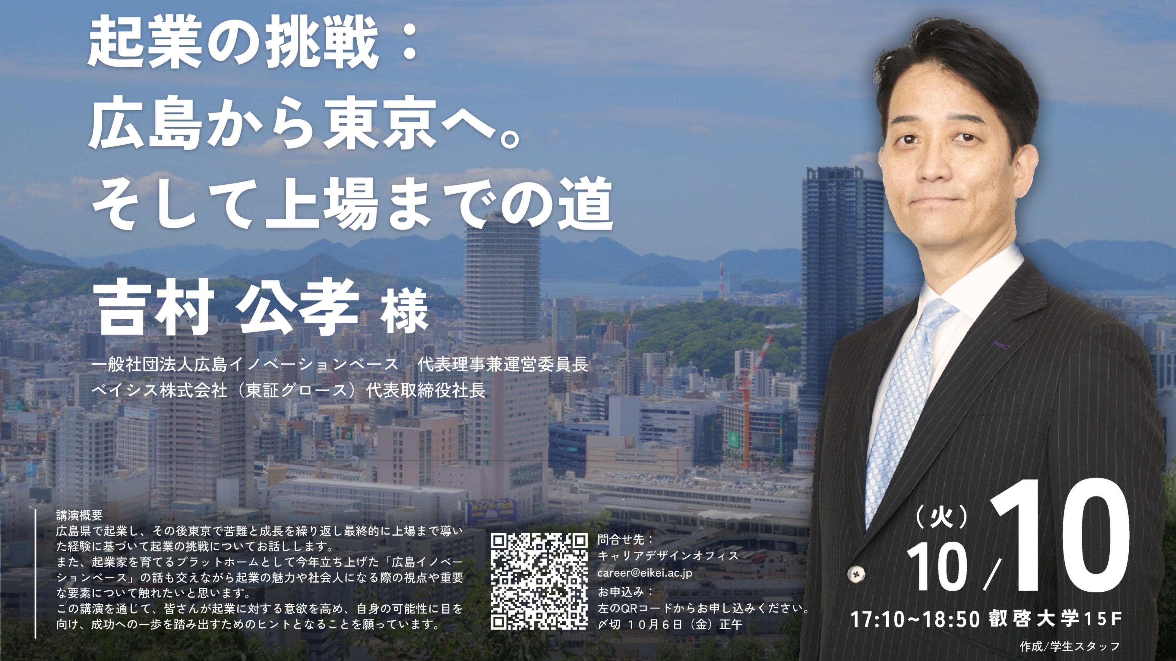 10/10(火) | 吉村 公孝 様 「起業の挑戦:広島から東京へ。そして上場までの道」 |