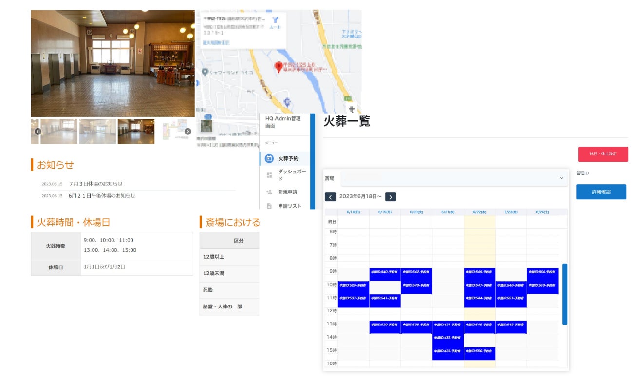 トップ画面には、あらかじめアクセス許可を得た事業者・担当者のみが可能な「ログイン機能」があり、また「お知らせ機能」では火葬場の予約可能時間や休場・メンテナンス情報をわかりやすく表示。