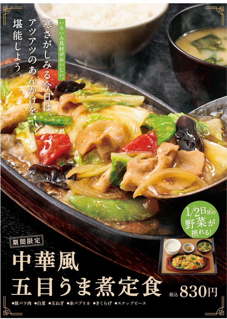 「やよい軒」冬本番のこれからの季節に! 1/2日分の彩り豊かな野菜が摂れるアツアツとろ~りあんかけ『中華風五目うま煮定食』2022年1月7日(金)より新発売