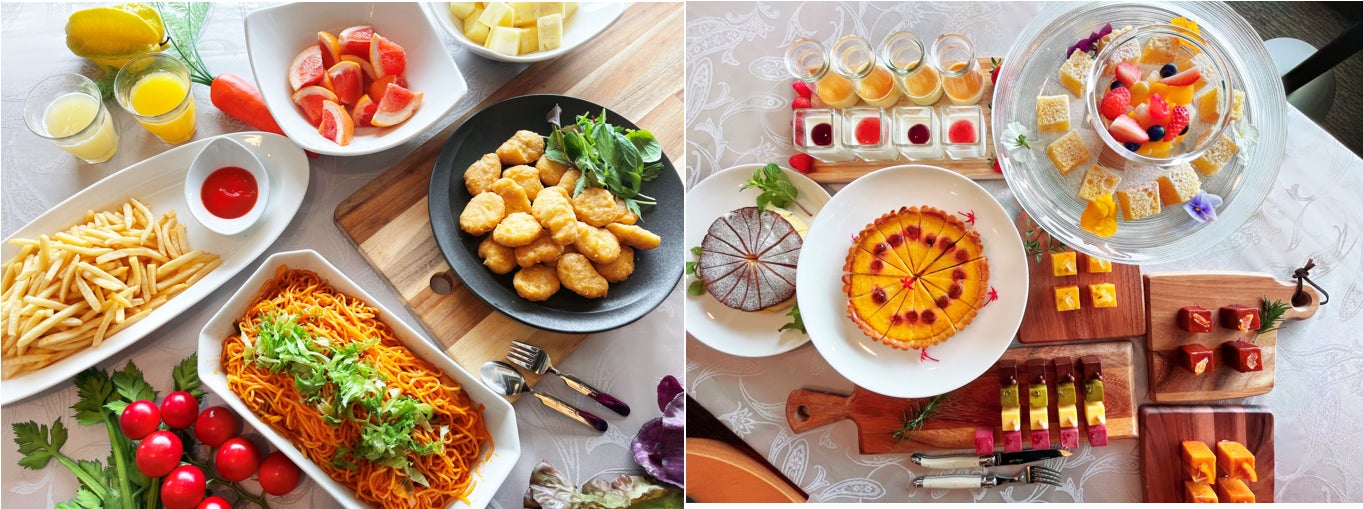 2. お子さまコーナーとスイーツコーナーがグレードアップ。ケーキ、パスタ、ナゲットなど、お子様が好きなお料理に加えて、自分で作れるミニハンバーガーも登場します。