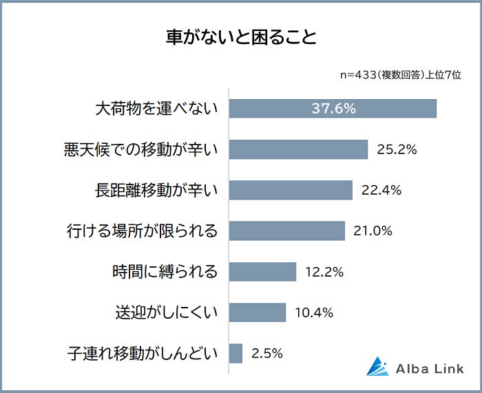 車なしの生活をしている人に聞いた「車がないと困ること」の1位は「大荷物を運べない(37.6%)」でした。2位「悪天候での移動が辛い(25.2%)」、3位「長距離移動が辛い(22.4%)」が続きます。