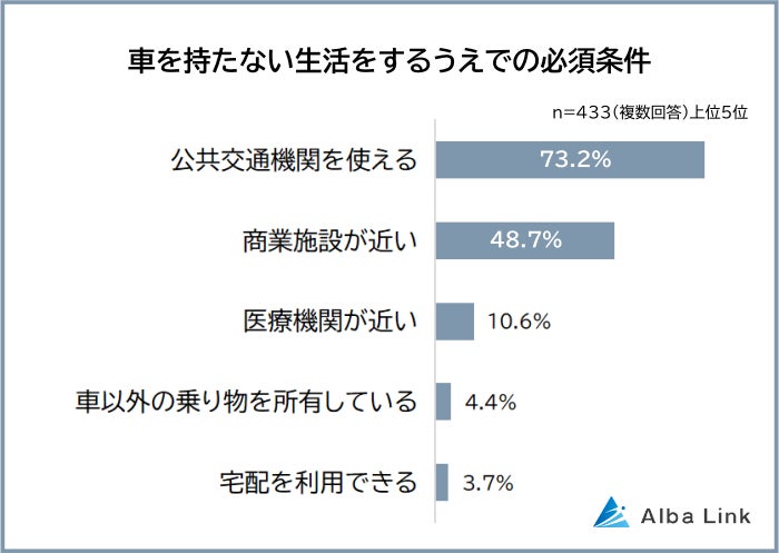 今回、株式会社AlbaLink( https://albalink.co.jp/ )が運営する訳あり物件買取プロ( https://wakearipro.com/ )は、車なしの生活をしている433人を対象に「車を持たない生活のメリット」についてアンケート調査を実施しました。