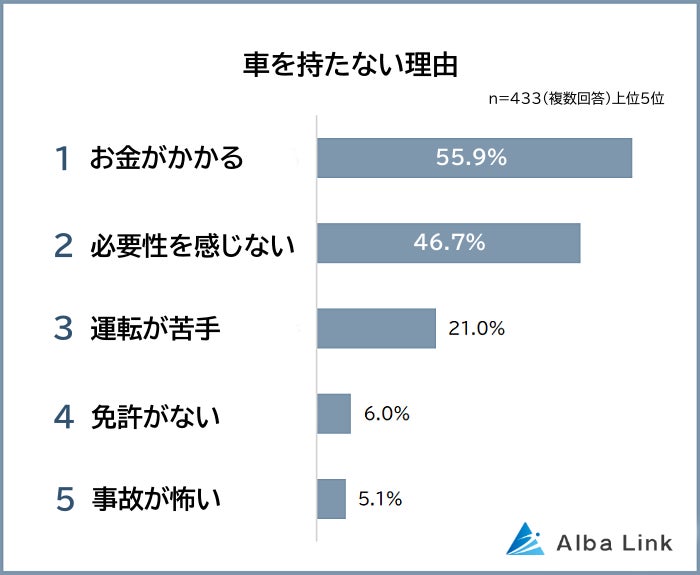 車なしの生活をしている433人に「車を持たない理由」を聞いたところ、1位は「お金がかかる(55.9%)」、2位は「必要性を感じない(46.7%)」でした。