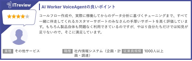 株式会社AI Shift(本社:東京都渋谷区、代表取締役社長:米山結人、以下AI Shift)が提供するAI自動対話システム「AI Worker VoiceAgent」はIT製品・SaaSのレビューサイト「ITreview」が実施する「ITreview Grid Award 2026 Spring」のボイスボット部門において、「Leader」を受賞いたしましたので、お知らせいたします。