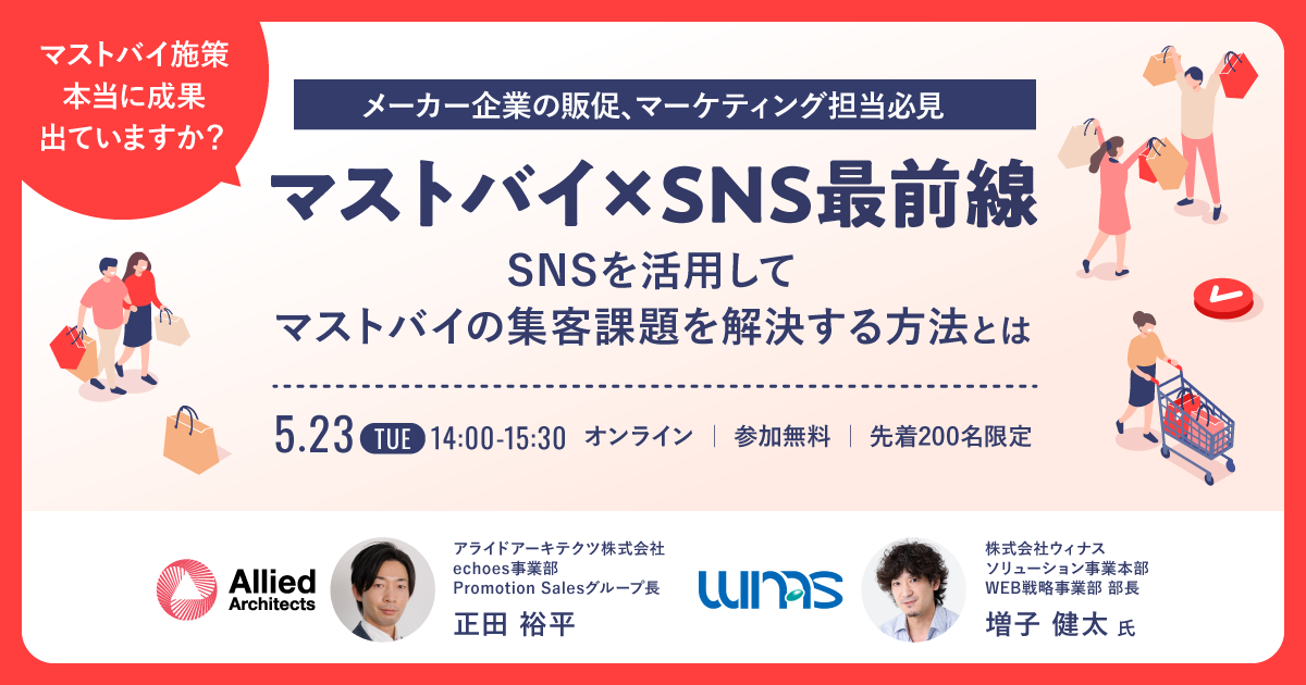 企業のマーケティングDXを支援するアライドアーキテクツ株式会社(東京都渋谷区、代表取締役社長 CEO:中村壮秀、証券コード:6081)でSaaS事業を展開するプロダクトカンパニー(プレジデント:村岡弥真人)が提供するSNSマーケティング支援SaaS「echoes(エコーズ)」は、SNSを活用してマストバイの集客課題を解決する方法を解説するオンラインセミナー「マストバイ×SNS 最前線」を5月23日(火)に開催します。