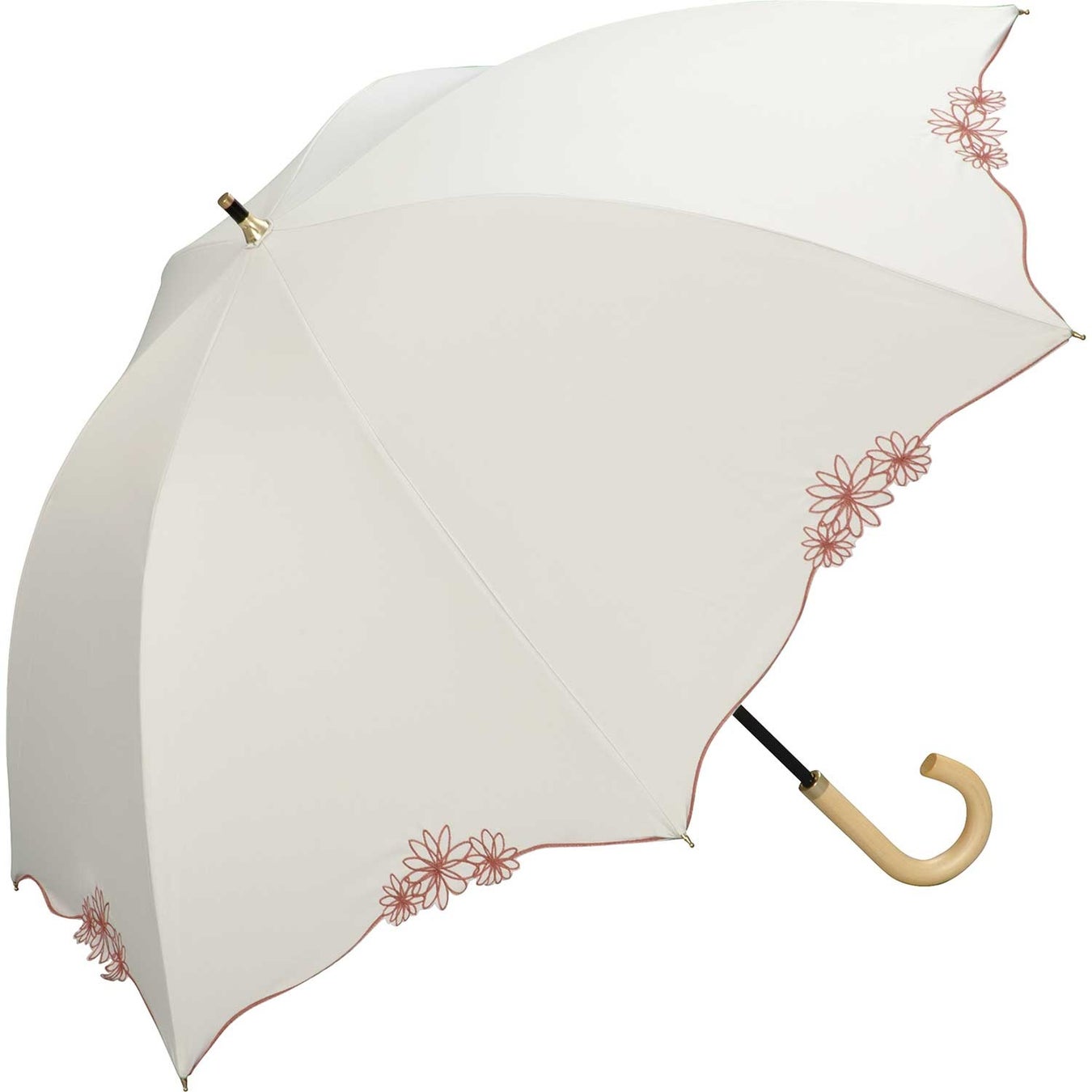 あらゆるファッションに馴染むベースカラーと傘を縁取るオレンジの花柄の刺繍がかわいらしいUVカット率・遮光率100%生地を使用した日傘。丸みを帯びたシルエットで夏の日差しをしっかりカバー。