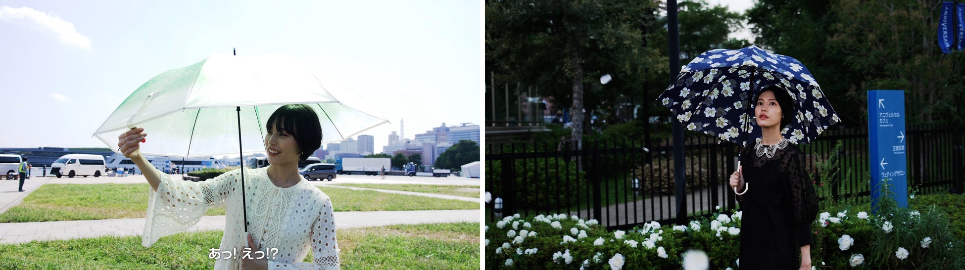 そして、今度は打って変わってラフなTシャツ&デニム姿の南さんが登場!白にピンクの小花をあしらった日傘(遮光ドームパラソルリムフラワー)をさしながら公園のベンチで一休み。すると風にあおられ日傘が飛んで行ってしまう、そんなかわいらしいシーンです。「3,2,1」とカウントダウンに合わせてタイミングよくスタッフが日傘を引っ張り上げるのですが、そのあまりの勢いに思わず笑みがこぼれます。