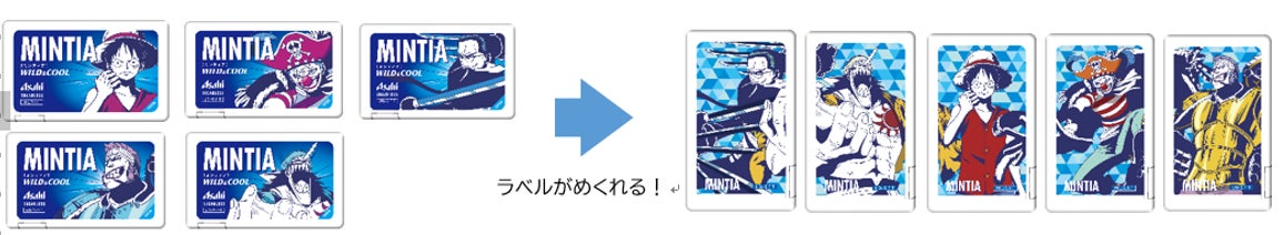 「ミンティア」シリーズ4商品を対象に、「ルフィの旅路の振り返り」をテーマに主人公の「ルフィ」が今までに出会った仲間や強敵のキャラクターをパッケージに描いています。パッケージには2層ラベルを採用し、1層目のラベルをはがすと、2層目には異なった描き下ろしのオリジナルデザインが登場します。また、2層目のデザインをつなげると1つの絵が完成する仕掛けになっています。デザインは各商品5種類で合計20種類です。
