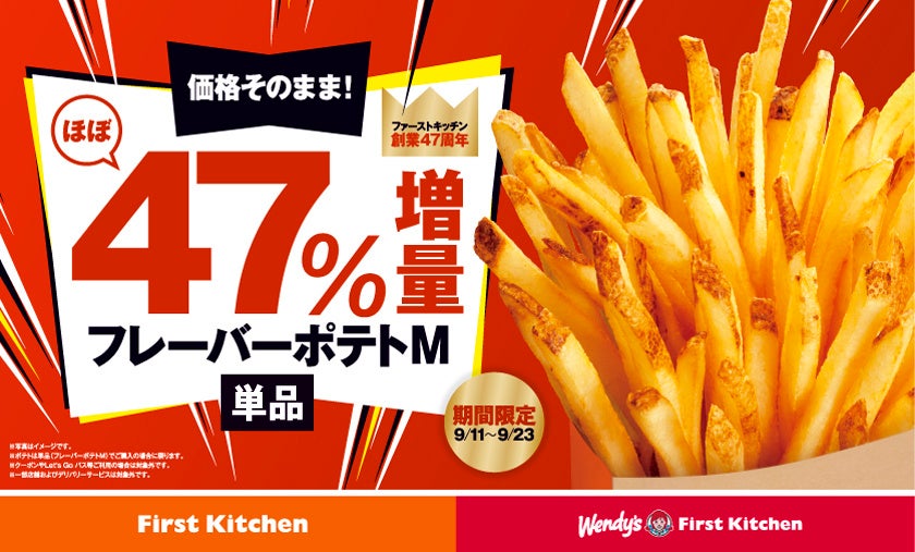 創業47周年企画!価格そのまま、“ほぼ”47%増量!フレーバーポテトMサイズ増量キャンペーン実施 9/11(水)~13日間 ウェンディーズとファーストキッチン全店で