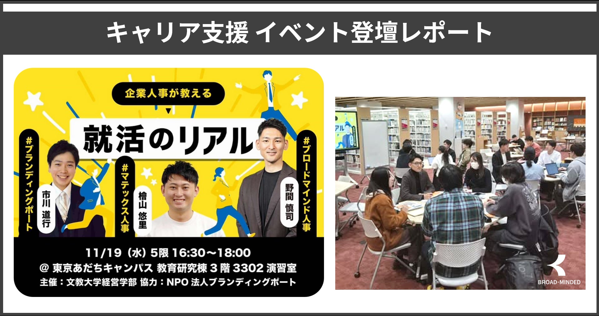 「金融の力を解き放つ」というパーパスのもと、ライフプラン実現を支援する金融サービスを開発・提供するブロードマインド株式会社(本社:東京都渋谷区 代表取締役社長:伊藤清 証券コード:7343 以下:当社)は、11月19日に文教大学経営学部(東京あだちキャンパス)にて開催された「企業人事が教える 就活のリアル」セミナーに登壇しました。